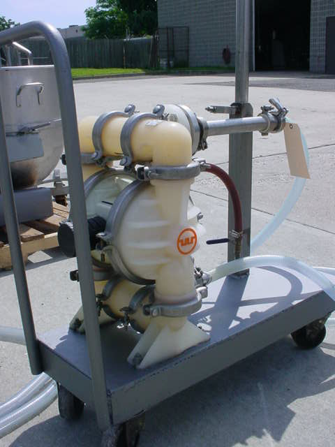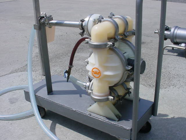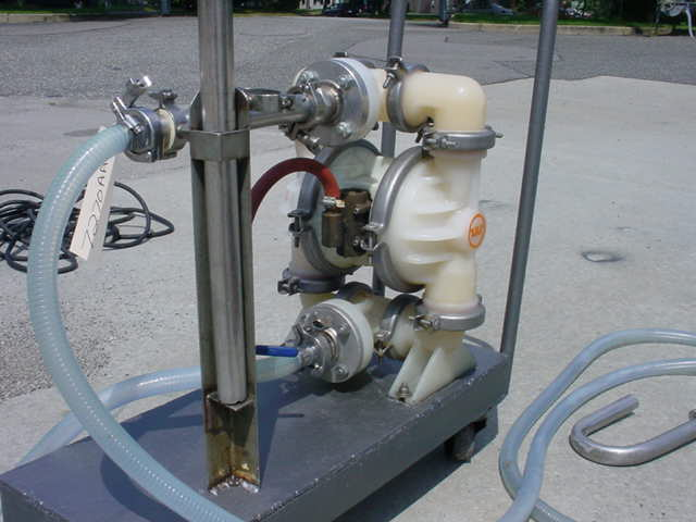 1-Used wilden approx. 2″ diameter air operated double diaphragm pump with stainless steel fittings. Pump is on portable stand with casters.