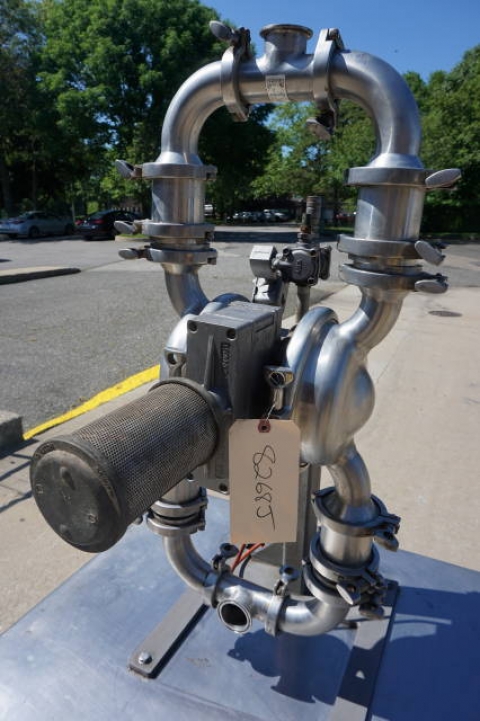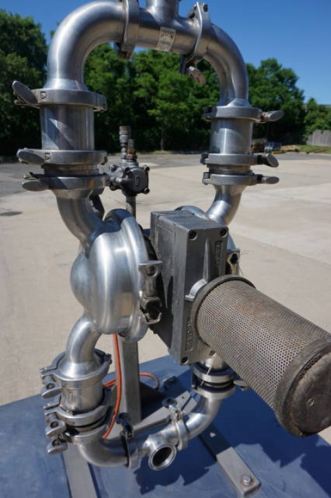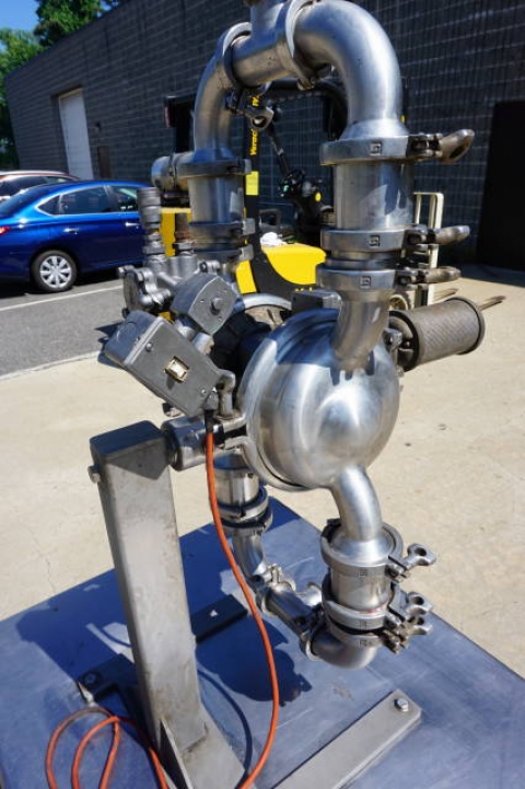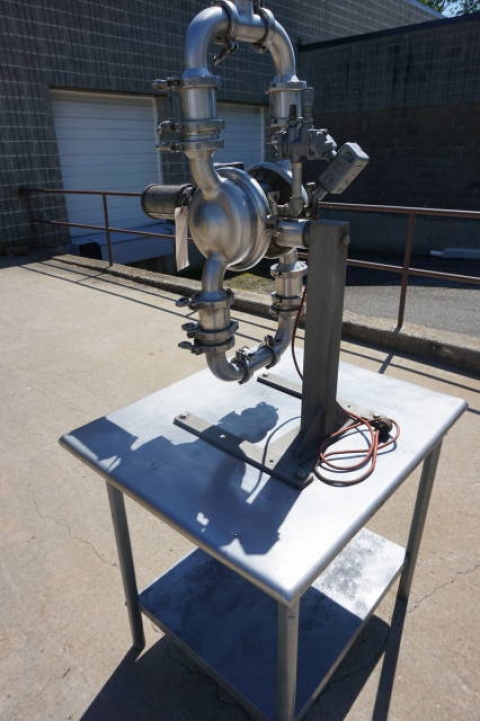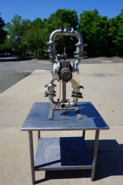 1-Used Wilden 2 In. Diameter Air Operated Double Diaphragm Pump.  Equipped with stainless steel piping, pump can be supplied mounted on table shown.  Last used in the food industry. (Stock #8268J)