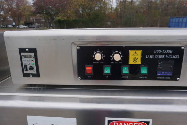 1-Pre-Owned BSS-1538B Stainless Steel Conveyor Shrink Tunnel. This unit, which is ideal for neck band shrink packaging, has a tunnel opening measuring approx. 10 In. wide X 13 In. high. Tunnel mounted on approx. 15 ft. long Stainless Steel Conveyor with approx. 7 in. wide Stainless Steel Tabletop Conveyor Chain. Tunnel has temperature controls, as well as speed controls. (Stock #8319E)