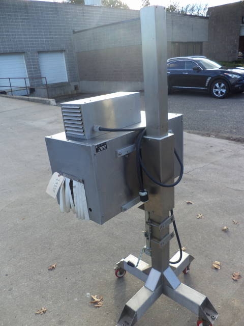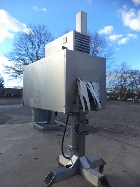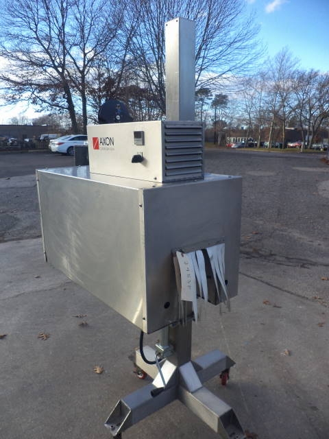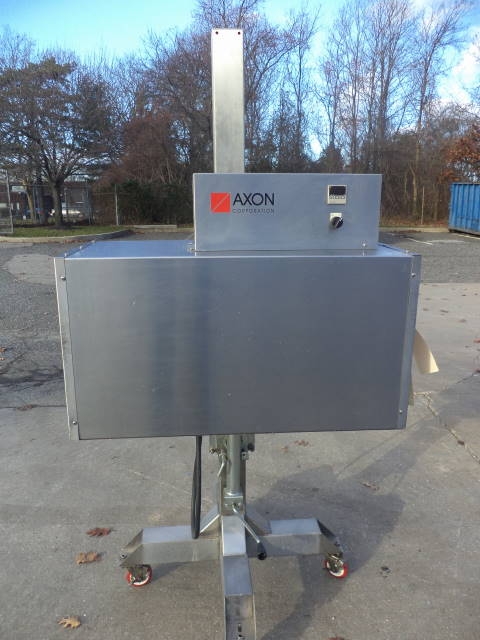 1-Used Axon EZ-36-SR9 Stainless Steel Shrink Tunnel, S/N E-001201. Mounted on stainless steel stand with casters for portability, Tunnel has approx. 8 in. wide opening. Electrical specifications 3 phase, 60 cycle, 220 volt. (Stock #7953F)