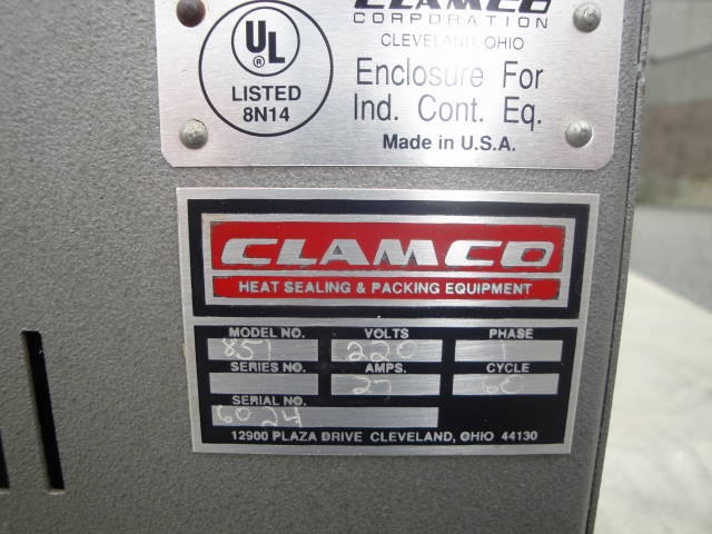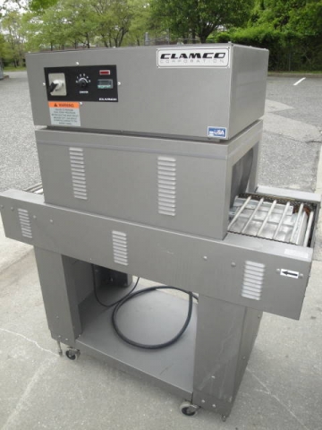 1-USED CLAMCO MOTORIZED SHRINK TUNNEL MODEL 851, S/N 6024. ON CASTERS FOR PORTABILITY, SHRINK TUNNEL HAS APPROXIMATE OPENING OF 15" WIDE X 8.5" HIGH. WITH VARIABLE SPEED CONTROLS, UNIT IS ON STAND AND HAS SINGLE PHASE, 60 CYCLE, 220 VOLT ELECTRICS. (STOCK # 7492D)