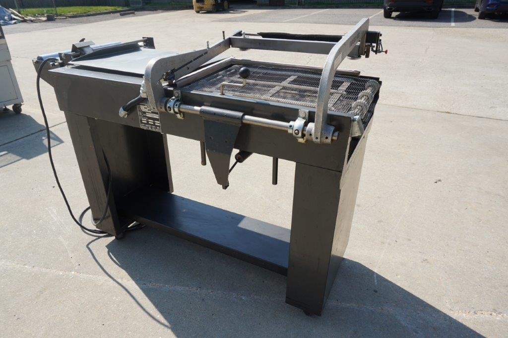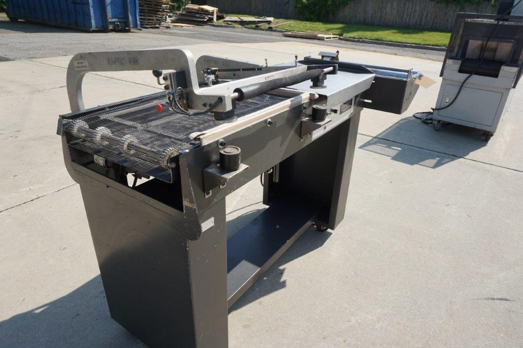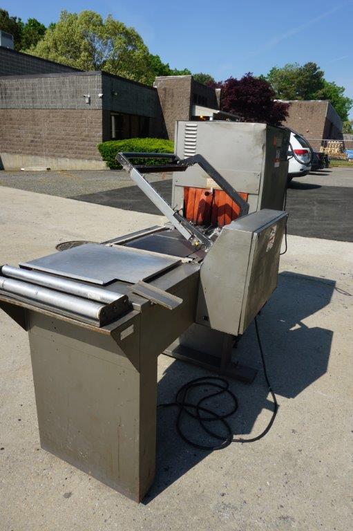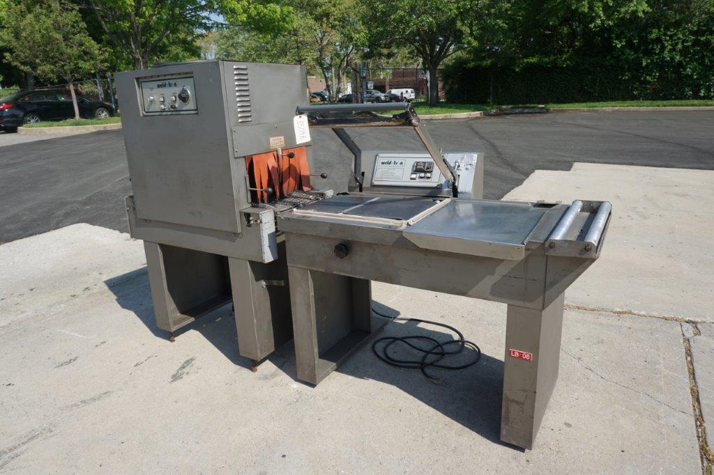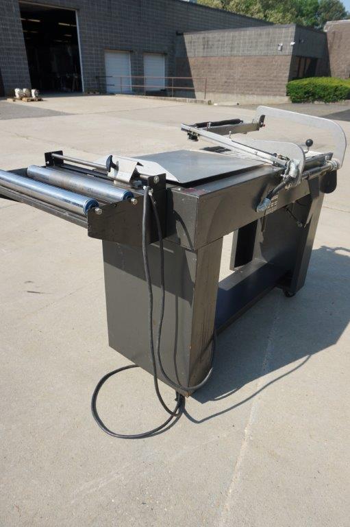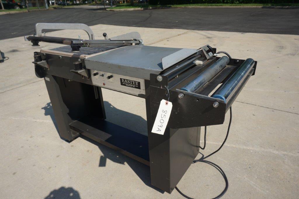 1-Used Jeff Eastey Model EM1622T Semi-Automatic “L” Bar Sealer, S/N 14641622TPP. On casters for portability, machine has single phase, 60 cycle 220 Volt electrics. Equipped with 16 In. wide takeaway belt, machine was last used in the cosmetics industry and can be supplied with shrink tunnel, if required, at an additional cost. (Stock #8509A)
