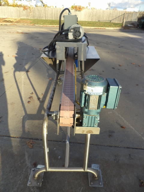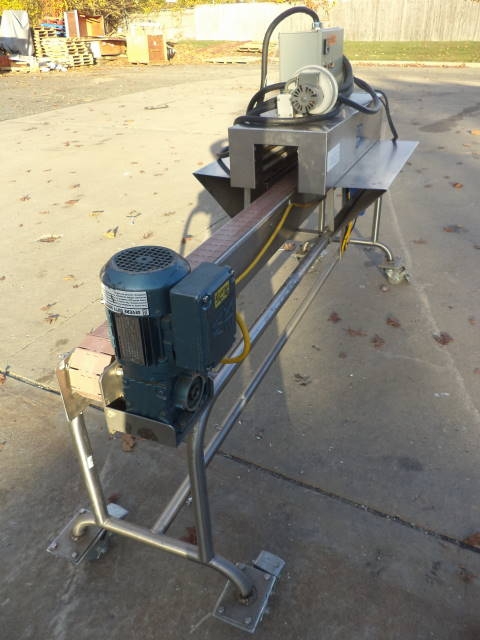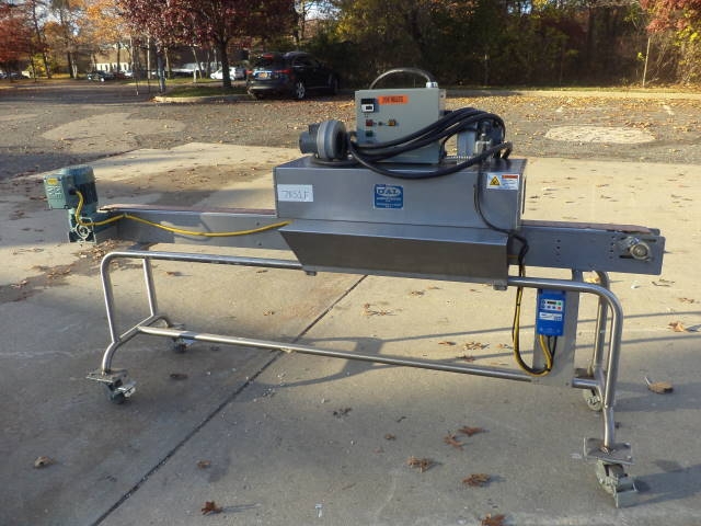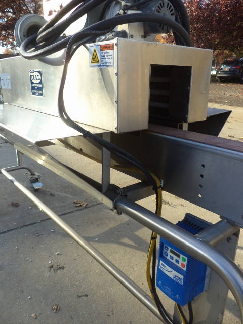 1-Used OAL Shrink Tunnel with approx. 6 in. wide X 6 in. high opening, S/N 1671. Mounted on approx. 8 ft. long Stainless Steel Conveyor with plastic tabletop chain, Conveyor is driven by 1/3 HP 3/60/230-460 volt motor with Lenze Digital Variable Frequency Drive. (Stock #7851F)