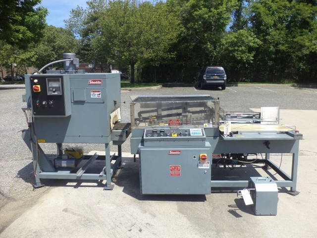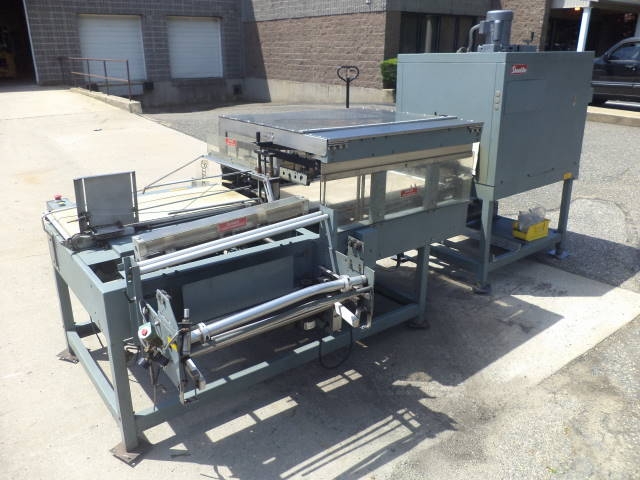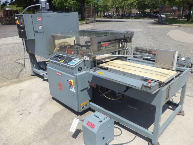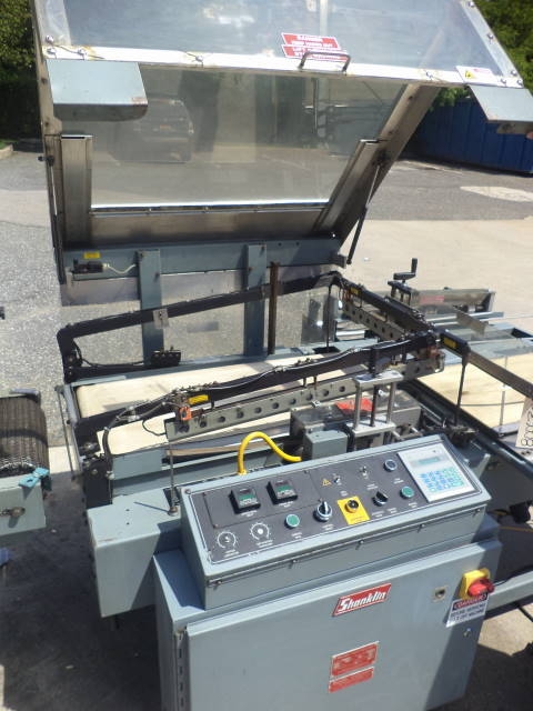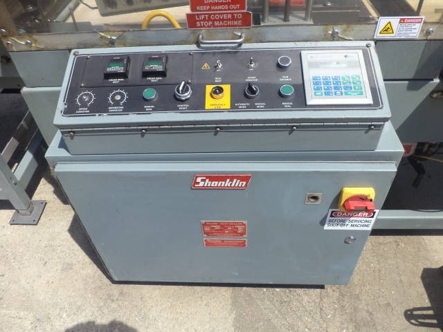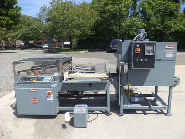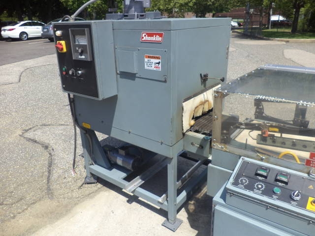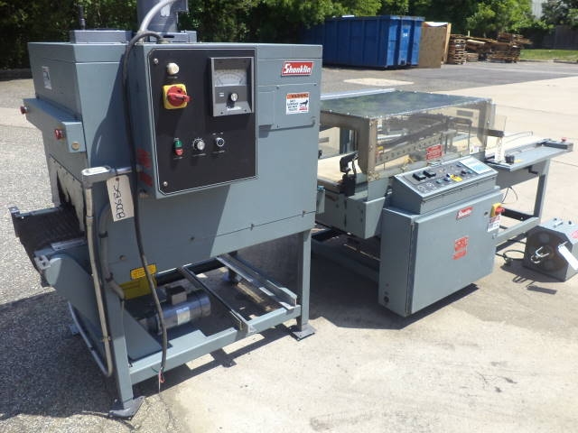 1-Used Shanklin Model A-27A “L” Sealer-Heat Sealer, S/N A96180. Electrical specifications: single phase, 60 cycle, 230 volt. There is AN approx. 16-1/2 in. wide Take Away Belt and machine is supplied with re-winder. Equipped with Shanklin T-74L Shrink Tunnel, S/N T-9909. Shrink Tunnel has 3 phase, 60 cycle, 230 volt electrics and measures approx. 22 in. wide X 8-1/2 in. high. (Stock # 8006BC)
