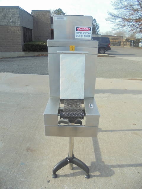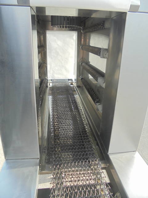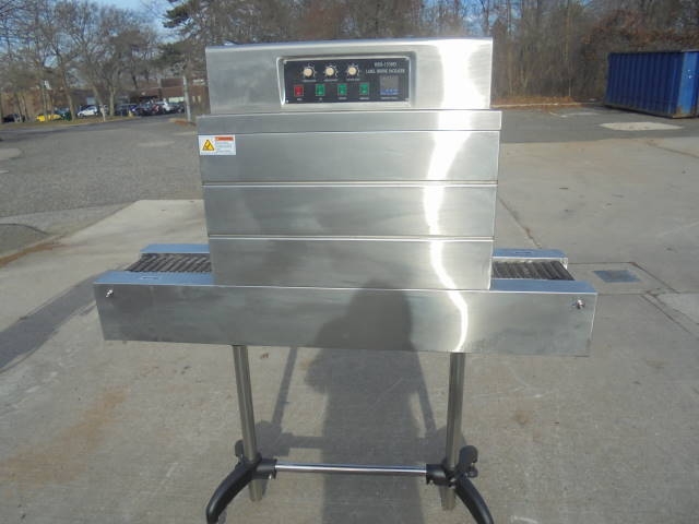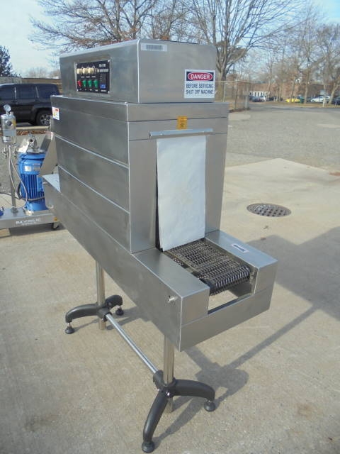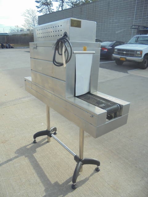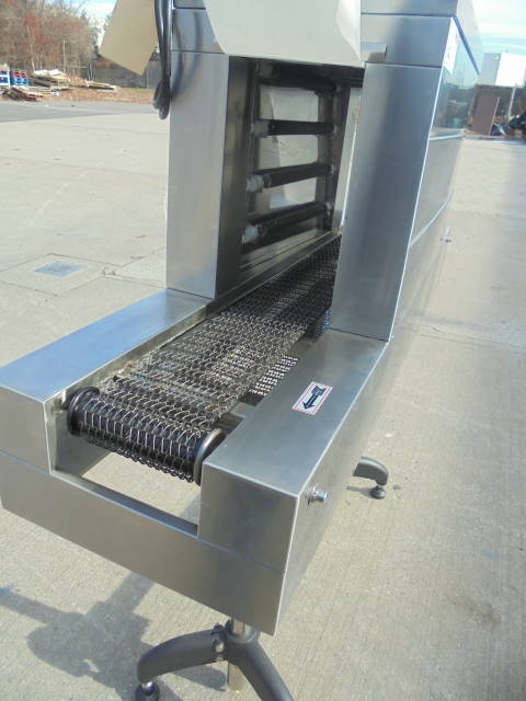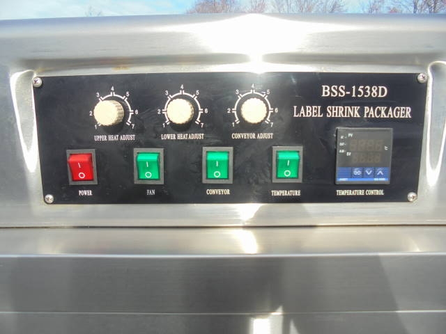 1-Used BSS-1538D Stainless Steel Shrink Tunnel With Conveyor.  Tunnel opening measures approx. 8 in. wide  X 15 in. high . This Tunnel has both heated adjustment controls and conveyor controls.  Equipped with approx. 6 in . wide belt, overall length with Conveyor is approx. 59 in.  On legs.  220 volt.  (Stock #8058B)