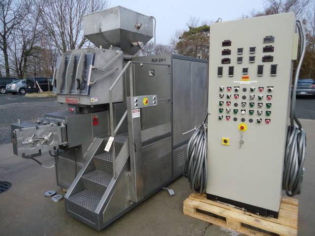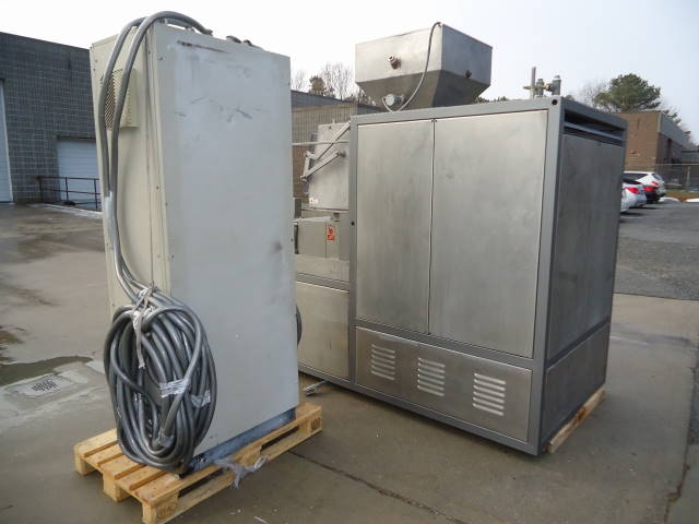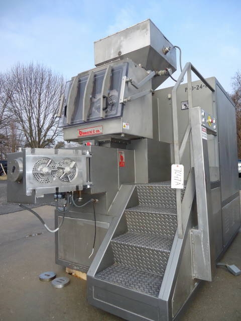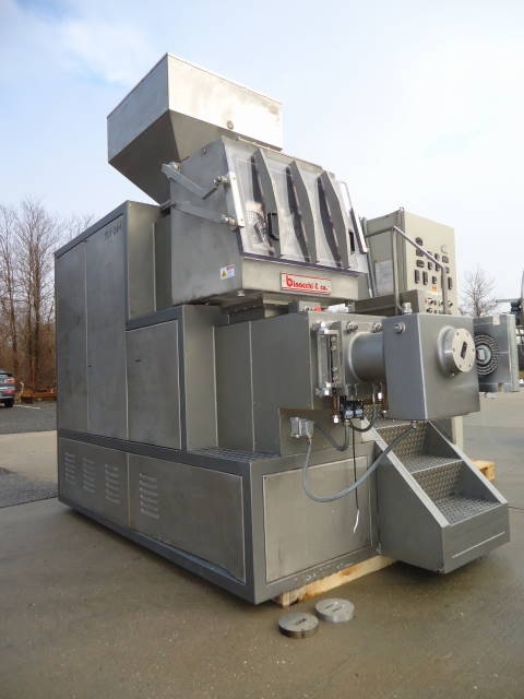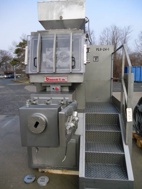1-USED BINACCHI MODEL DVPB-160 STAINLESS STEEL DUAL SCREW VACUUM PLODDER, SERIAL# 1663. EQUIPPED WITH 160MM TWIN SCREWS, MACHINE HAS VACUUM CHAMBER AND IS EQUIPPED WITH TWO (2) 1.5 HP LIQUID RING VACUUM PUMPS. WITH TWO (2) 7.5 HP MAIN DRIVES, PLODDER HAS FEED HOPPER, DIE FACE CUTTERS AND CONTROL PANEL. CAPACITY IS APPROX. UP TO 500 KG PER HOUR. FURTHER SPECIFICATIONS AVAILABLE UPON REQUEST. (STOCK # 7647A)