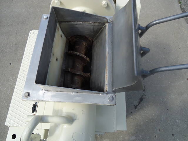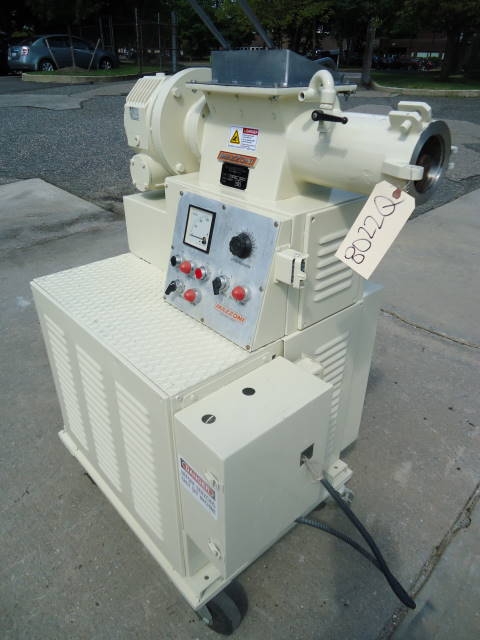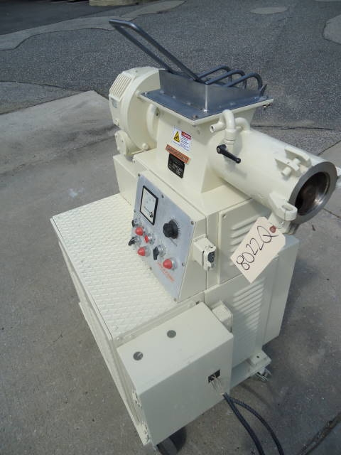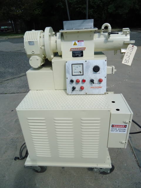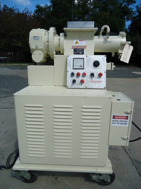 1-Used Mazzoni Type M100/CHW TG-2193 Soap Extruder/Plodder, S/N 480. Mounted on portable base with casters, Plodder has front mounted control panel with speed control and gauge. With top mounted hopper, this worm fed Plodder has single phase electrics. (Stock #8022Q)