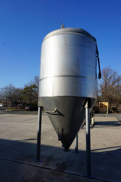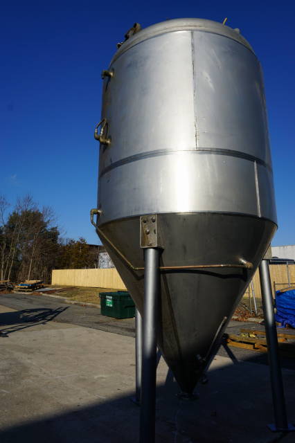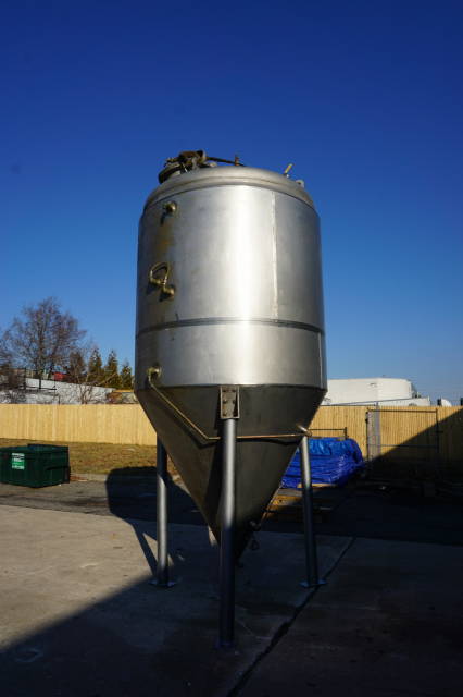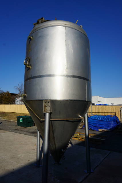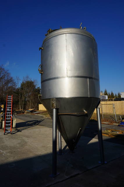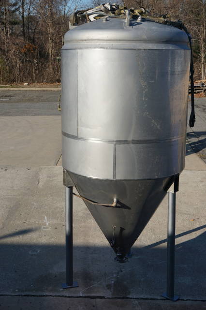 2-Used approx. 1,500 Gallon each Type 316 Stainless Steel Jacketed Cone Bottom Tanks. Dimensions approx. 72 in. inside diameter X 76 in straight side, plus 70 in. deep cone bottom head. With top 18 in. diameter manhole, Tanks have 4 in. diameter bottom outlet. On legs, last used in food product of shortening. (Stock #8334X)