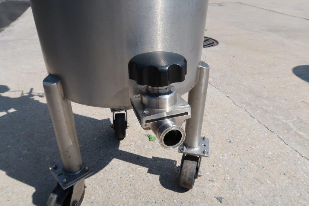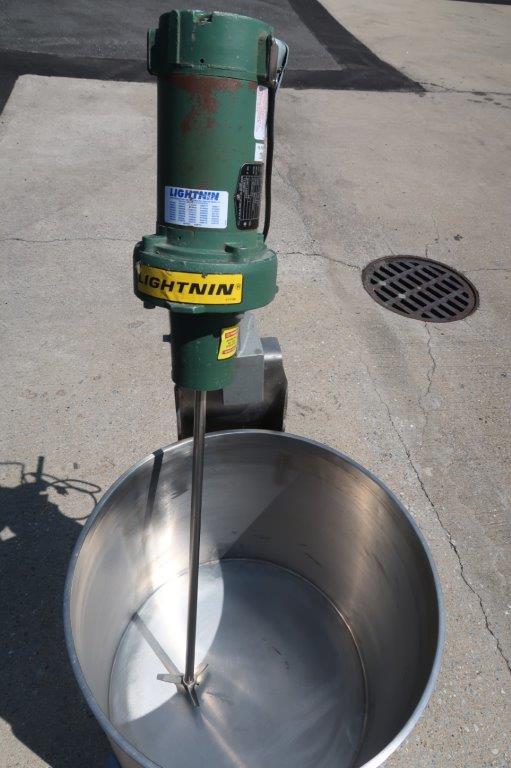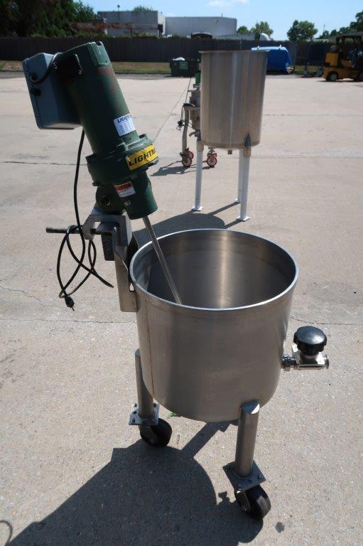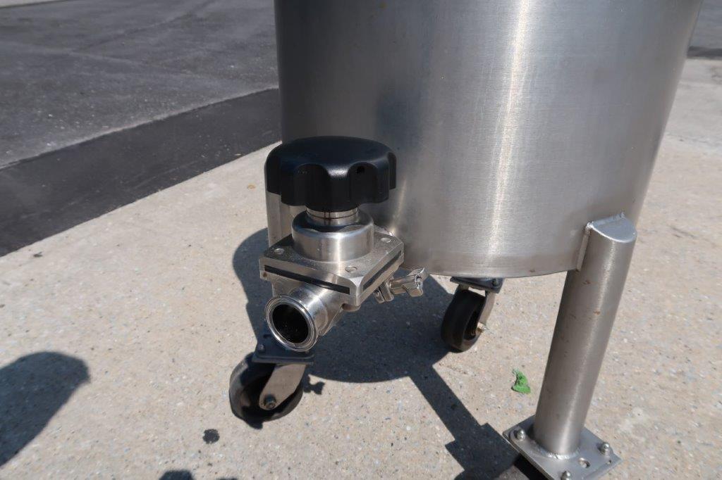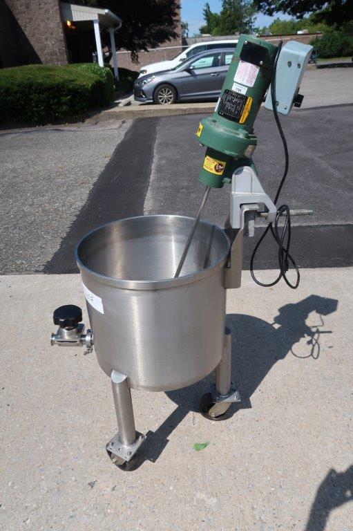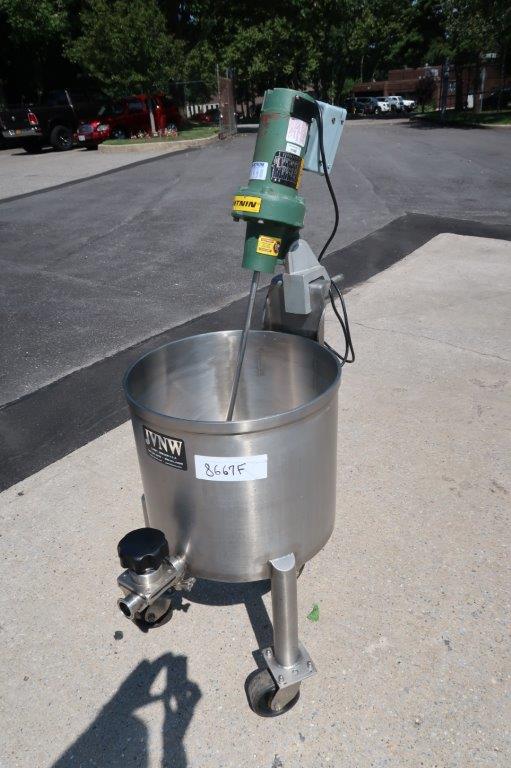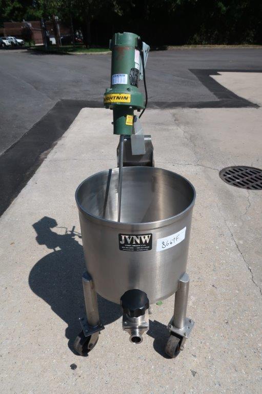 1 – Used JVNW approx. 20 Gallon Stainless Steel Portable Mix Tank. Dimensions approx.19 In. diameter X 17 In. deep, tank has sloped bottom with approx. 1-1/2 In. diameter discharge with tri-clamp style valve. On casters for portability, unit is equipped with Lightnin .25HP single phase agitator with stainless shaft and 4 In. pitched blade, and variable speed control (Stock # 8667F)
