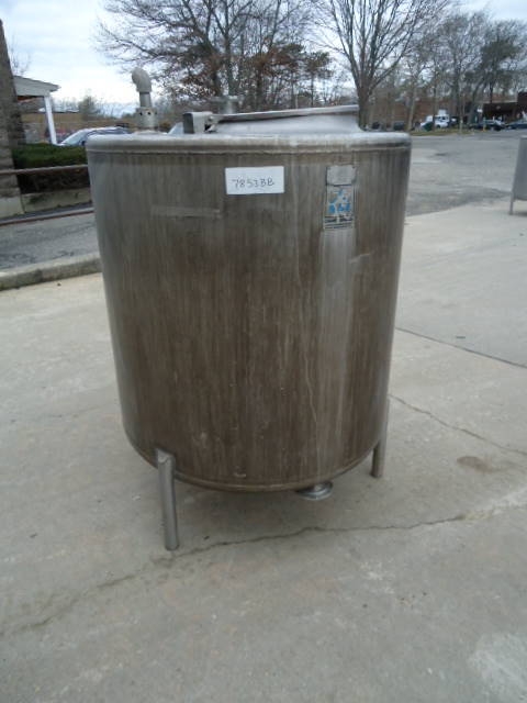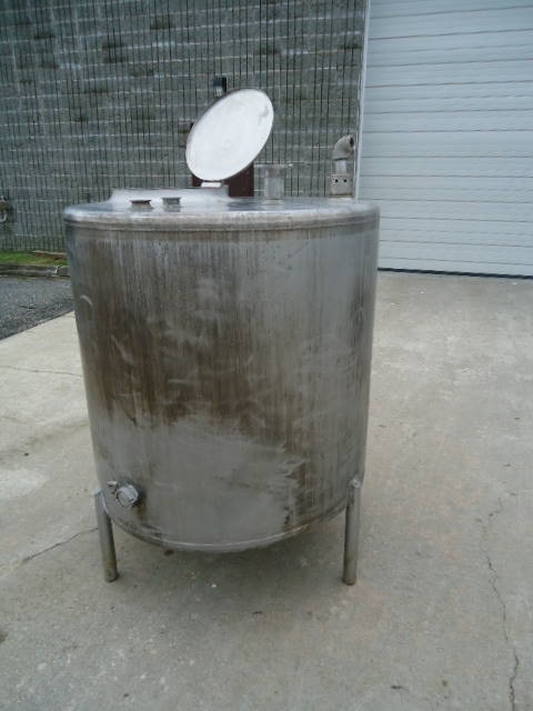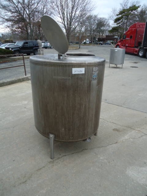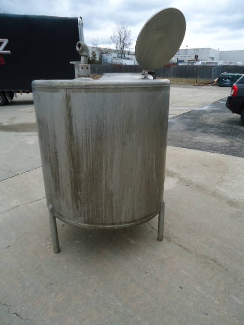 1-Used Cherry Burrell 200 Gallon Stainless Steel Vertical Tank, S/N E-109-92. Dimensions approx. 42 in. diameter X 42 in. deep, Tank has top head with approx. 16 in. manway with hinged lid and three (3) assorted smaller openings. On approx. 14 in. high stainless steel legs, Tank has approx. 2 in. diameter bottom discharge with pneumatic valve and approx. 2 in. diameter side discharge. (Stock #7853BB)