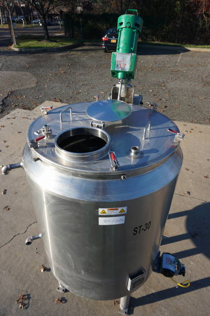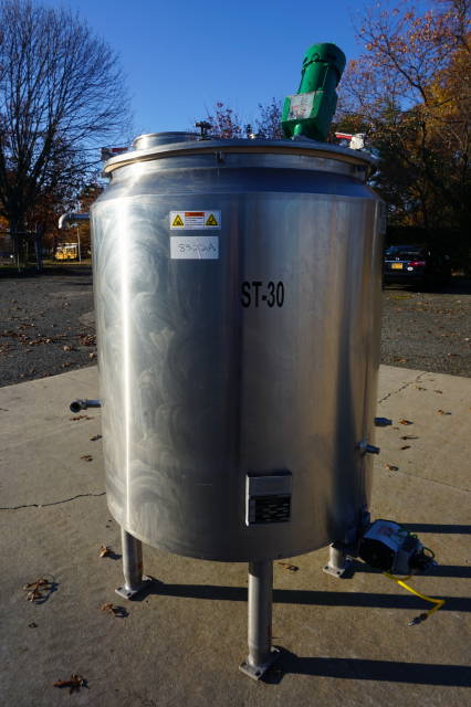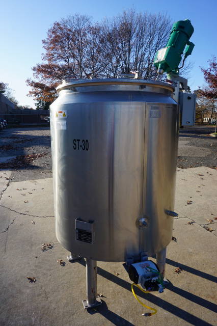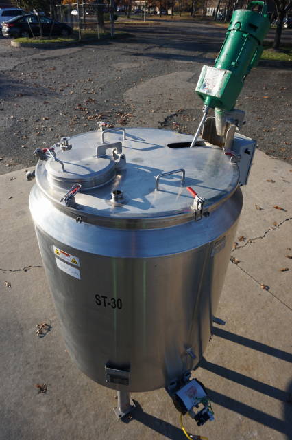 1-Used Feldmeier Approx. 200 Gallon Type 316 Stainless Steel Vertical Jacketed Mix Tank, S/N L2448-1. Dimensions approx. 39 In. diameter X 42 In. deep, Tank is jacketed for 85 PSI @ 250 Deg. F., National Board # 474, Code stamped. Equipped with approx. 2 In. diameter center-bottom tri-clamp outlet with air operated valve. Tank has stainless steel lid with “quick opening” clamps and 12 In. diameter top manway with cover. Equipped with two thermowells, Tank has stainless agitator mount and can be supplied with clamp-on agitator at an additional cost. On stainless legs, Tank was last used in food production. (Stock #8322A)