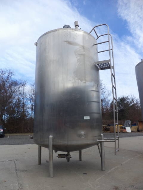 1-Used Cherry Burrell approx. 2,000 Gallon Stainless Steel Vertical Sanitary Mixing Tank, S/N E-102-92. Dimensions approx. 72 in. diameter X 110 in. on the straight side plus dished bottom head. With stainless steel side mounted staircase. Top head is approx. 18 in. diameter off center manway with hinged lid. With twin pitched blade agitators, top driven by 2 HP motor. Interior has twin CIP spray ball heads and interior baffle. Dished top head has five (5) assorted inlets in TANK. On approx. 32 in. high stainless steel legs. Equipped with approx. 2-1/2 in. diameter discharge with automatic valve. (Stock # 7853F)