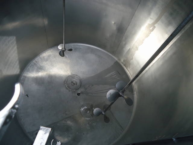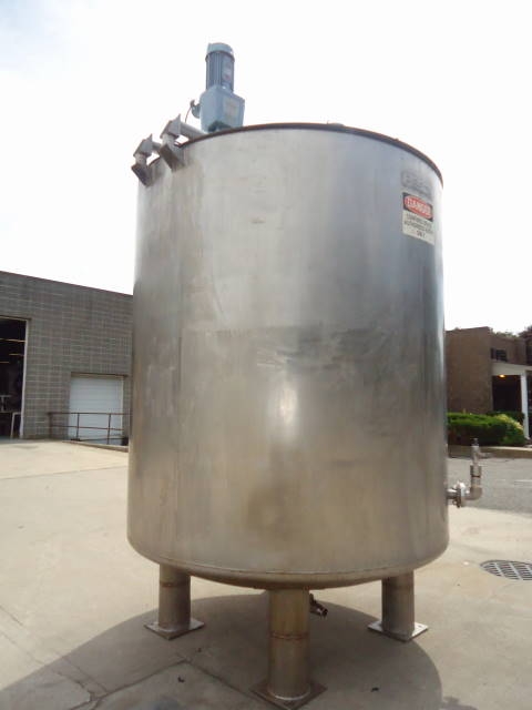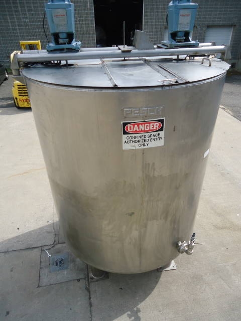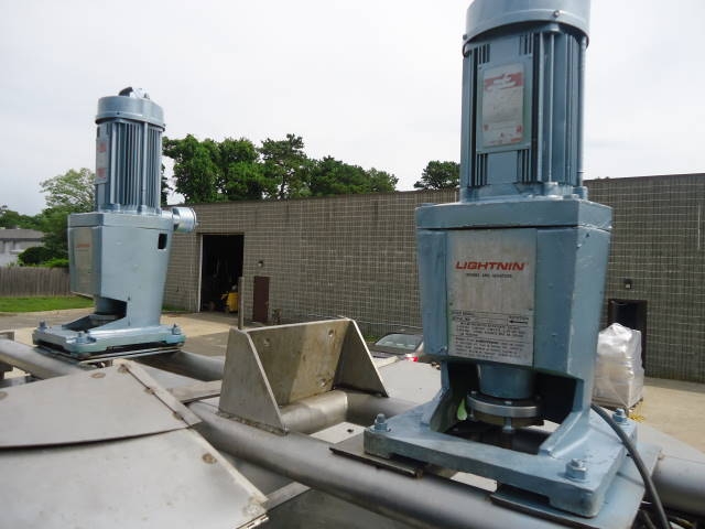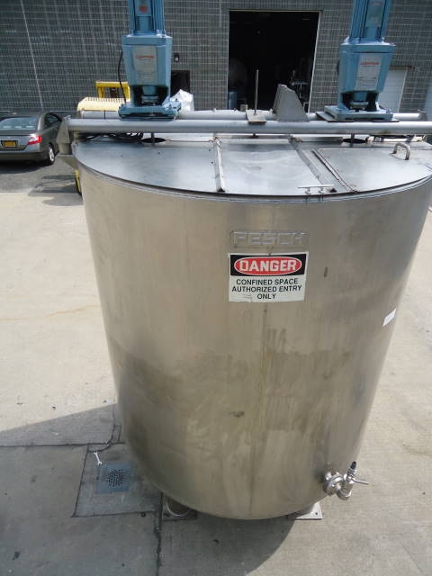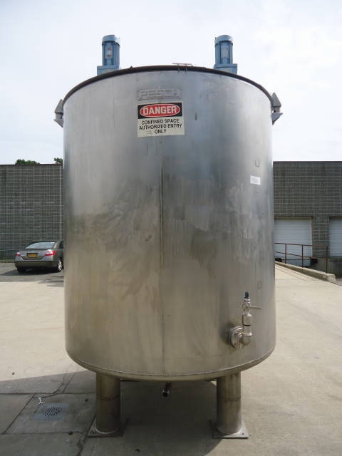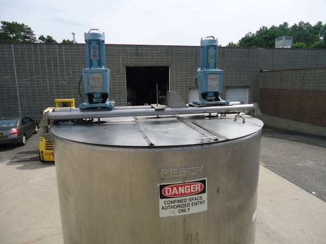 1-Used Pesch approx. 2,200 gallon Stainless Steel Vertical Mix Tank. Dimensions approx. 81 in. diameter X 90 in. on the straight side plus dished bottom head. On approx. 20 in. high stainless steel legs, Tank has lid and approx. 2 in. diameter center bottom outlet with hand operated valve. Equipped with top mounted Lightnin 3 HP, 3/60/230-460 volt and Lightnin 3.5 HP, 3/60/220-440 volt explosion proof agitator drives, for the two stainless steel shafts with propellers. (STOCK #7812E)