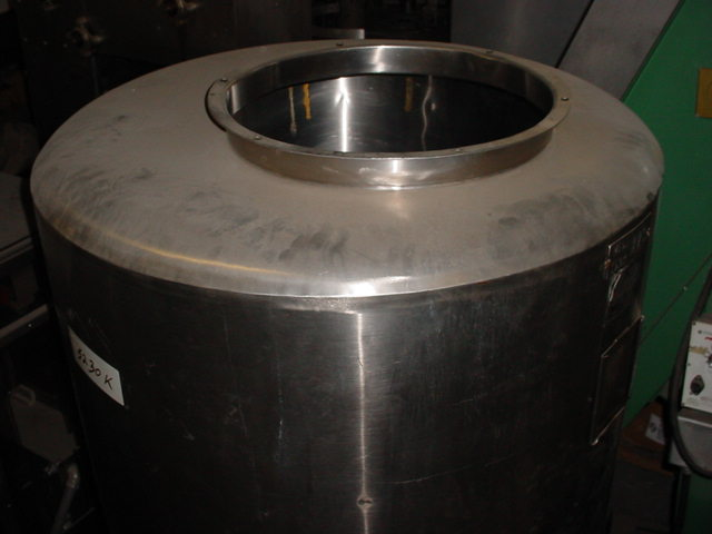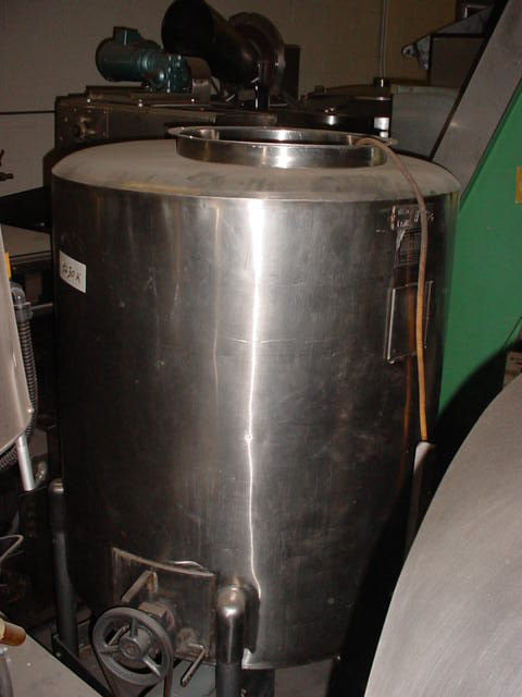 1-Used sanitank approximately 230 gallon stainless steel vertical portable tank, serial #33398. Dimensions approx. 40″ diameter by 44″ deep. With side entering propeller agitator, approx. 10″ diameter, driven by electric motor. Top of tank is partially closed, with off-center 20″ diameter manway. With sloped bottom with 1″ diameter bottom outlet. On casters.