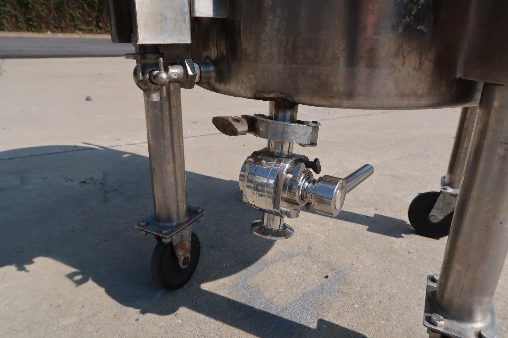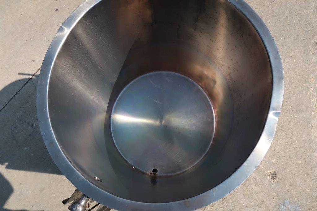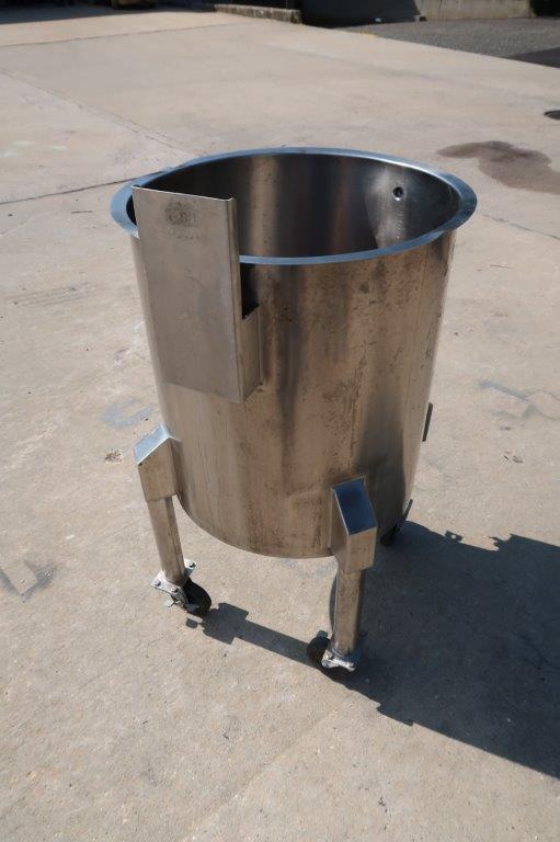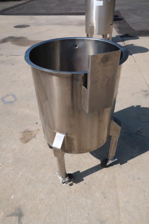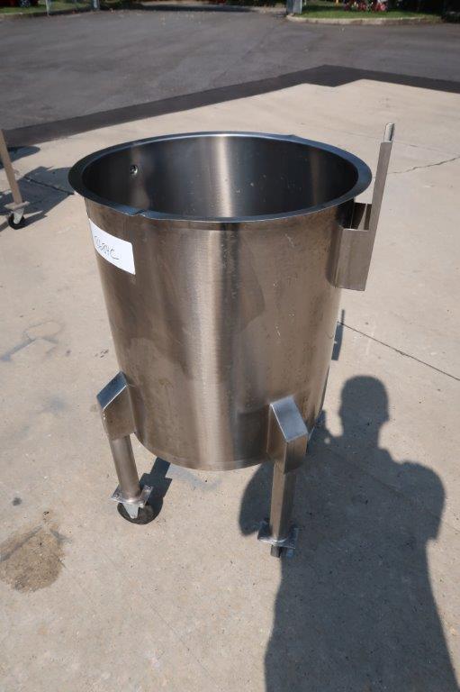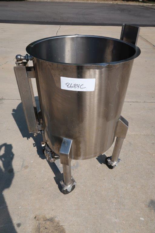 1-Used Approx. 25 Gallon Stainless Steel Vertical Portable Tank.  Dimensions approx. 20 In. diameter X 22 In. deep, tank has sloped bottom with approx. 1 In. diameter discharge valve. With stainless steel agitator mount and sight glass.  (Stock #8684C)