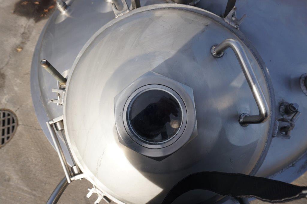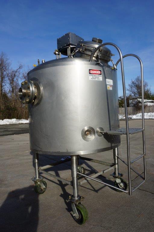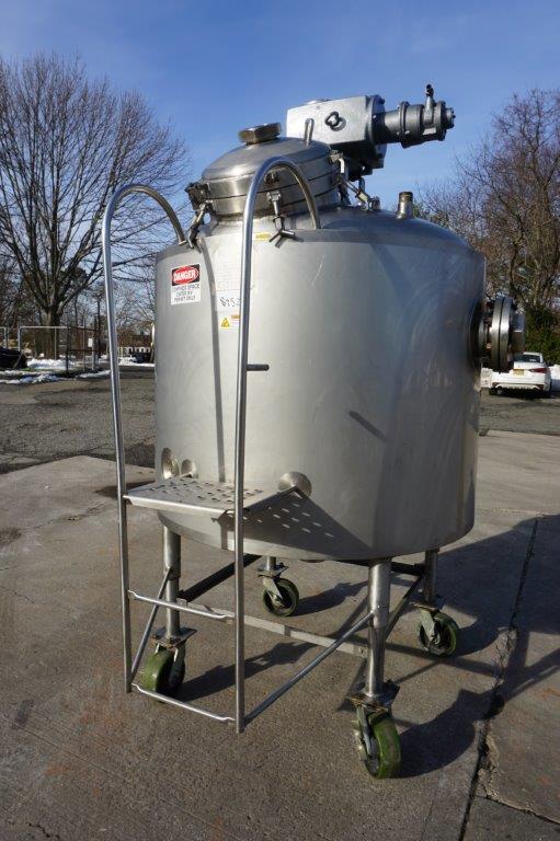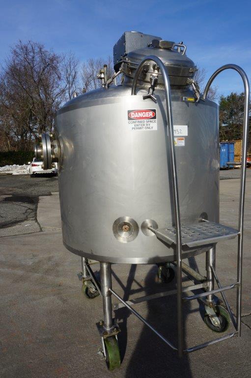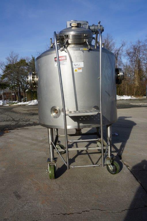 1-Used Walker Stainless 250 Gallon Stainless Steel Jacketed Pressurized Kettle/Reactor, S/N 2440. Interior dimensions measure approx. 52 In. diameter X 36 In. deep plus dished top and bottom heads. Vessel is rated 125 PSIG in the jacket at 300 Deg. F. and rated internally 60 PSIG at 300 Deg. F., National Board number 642, code stamped. Equipped with side and bottom heavy-duty scraper agitation, driven by top mounted Eurodrive 4.5HP pneumatic drive (air driven) for explosion proof environment. Also equipped with interior stationary baffle and CIP spray-ball. Top dished head has 18 In. diameter manway with gasket and hinged lid, as well as assorted top inlets. With stainless side mounted staircase, vessel has approx. 4 In. diameter center bottom discharge outlet along with three side outlets, each measuring approx. 6 In. diameter. On legs with casters for portability. (Stock #8452)