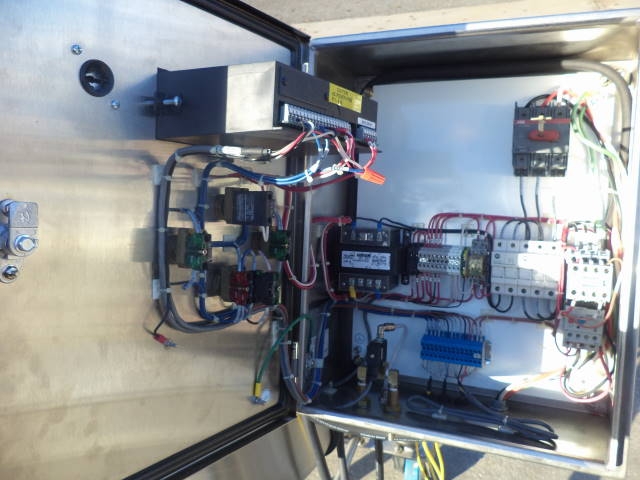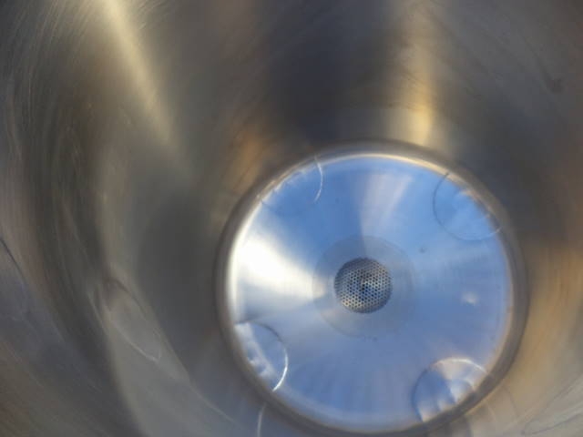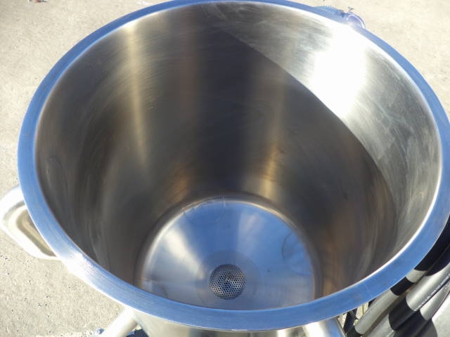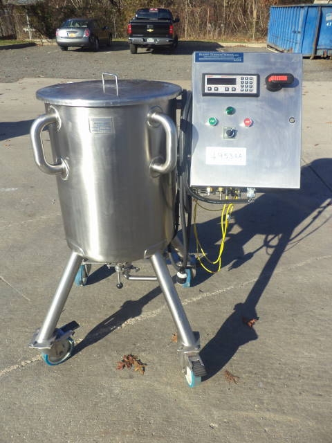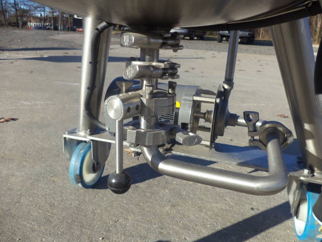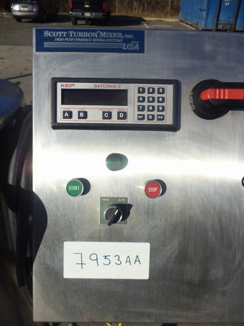 1-Used Scott Turbon Mixer, Inc. 30 gallon Stainless Steel Vertical Sanitary Portable Tank, S/N 7011. Dimensions approx. 19 in. diameter x 25 in. deep plus dished bottom head. Mounted on heavy duty tubular legs with casters for portability, tank has top lid and center bottom outlet discharge with valve. With .5HP feed pump, tank has side mounted KEP “Batchtrol II” starter box with controls. (Stock #7953AA)