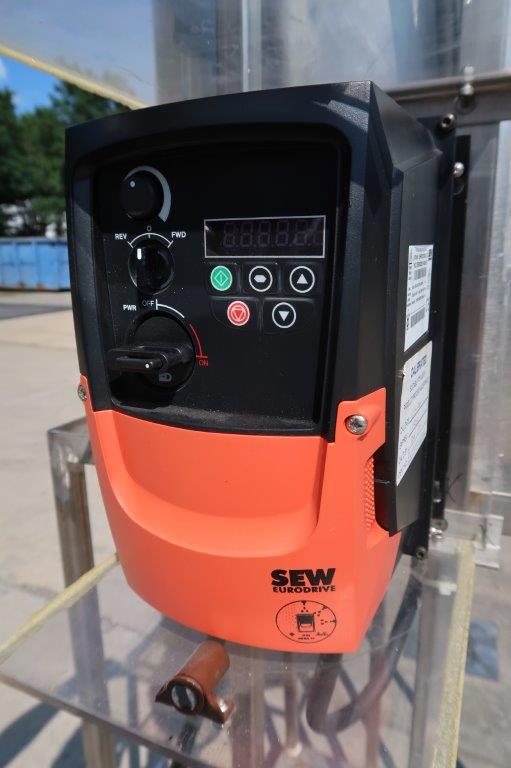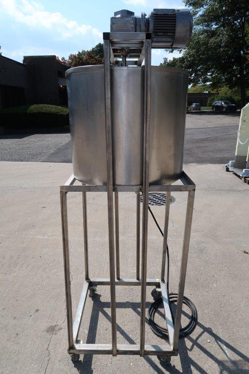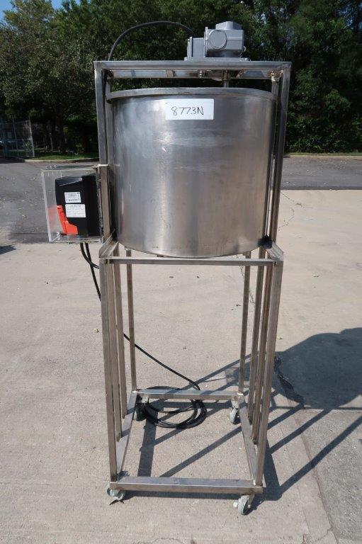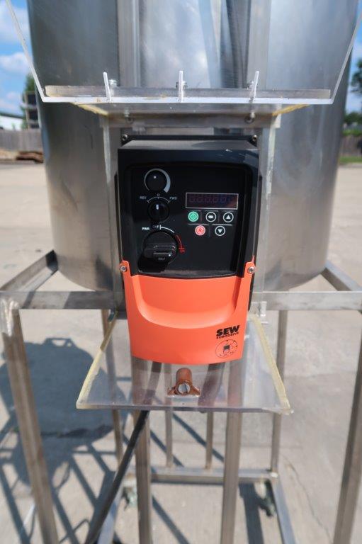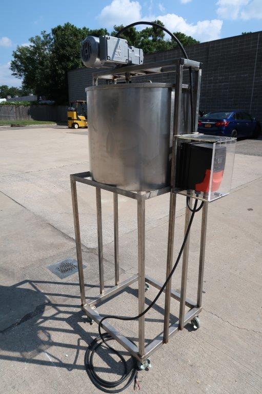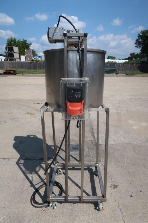 1 – Used approx. 30 Gallon Stainless Steel Portable Mix Tank. Dimensions approx. 24 In. diameter X 20 In. deep. Equipped with multiple discharge ports. On casters for portability, the unit is equipped with a fractional motor 3-phase agitator with a stainless shaft. The unit is equipped with a SEW Eurodrive VFD. (Stock # 8773N)