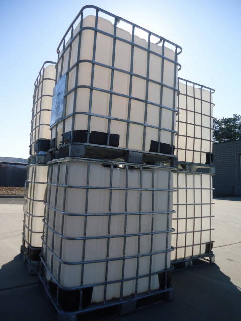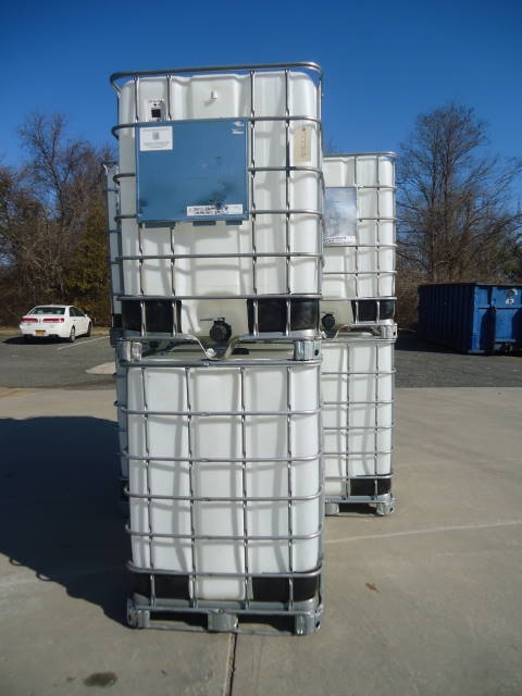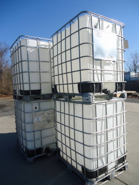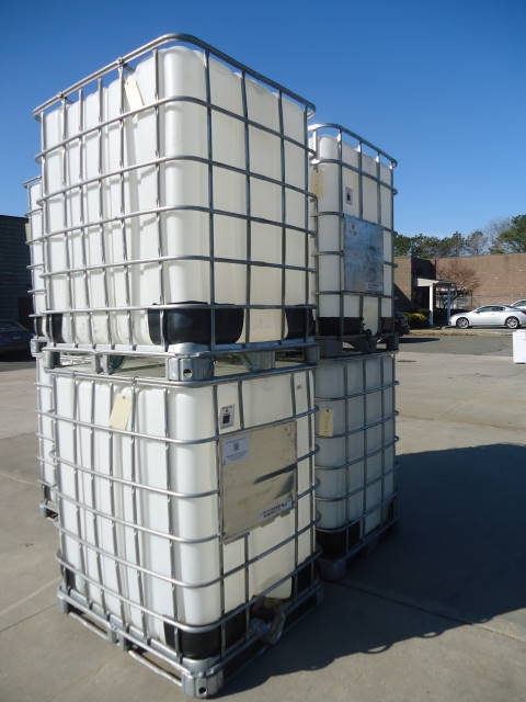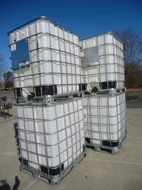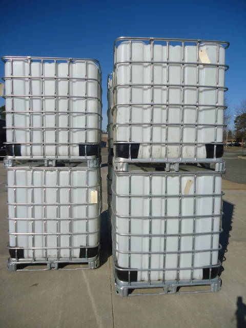 6-Used industrial tote services 330 gallon poly stackable totes. Mounted on “forklift capable” skids, dimensions of totes, without skids, is approximately 36 inch wide by 44 inch long by 46 inch high. With support frames for stability, each has a top opening of 5-1/2 inch diameter and bottom outlet with valve (stock# 7770d).