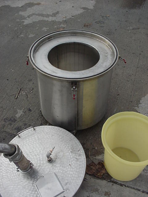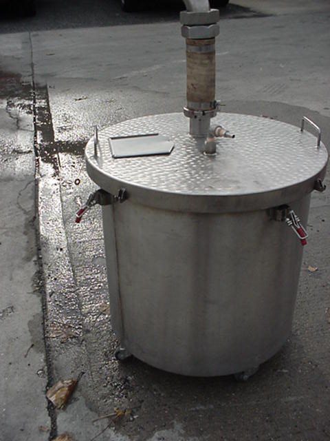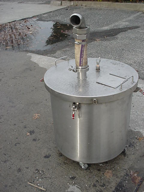On casters for portability, tank has pressure top lid with approx. 2″ diameter port.