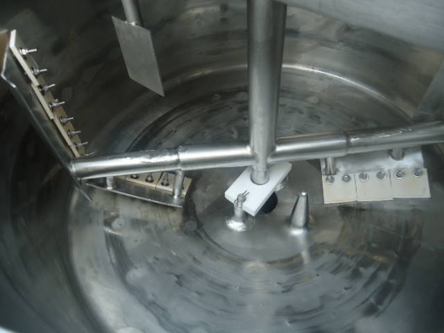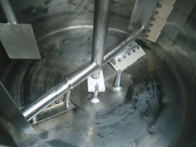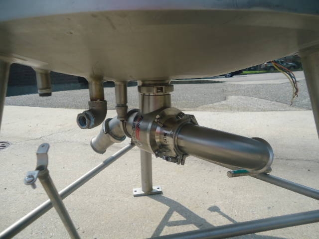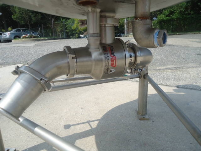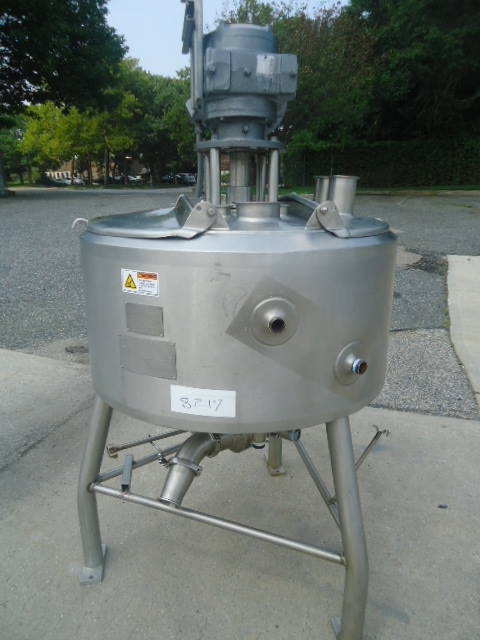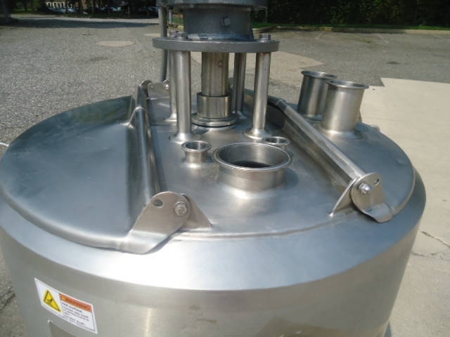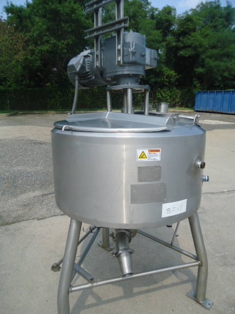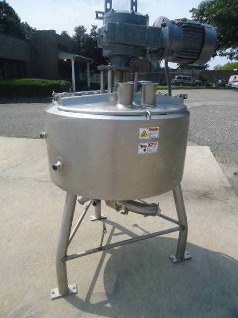 1-Used Crepaco Approximately 50 Gallon Stainless Steel Jacketed Scraper Agitated Process Vessel, S/N C-4985. Interior dimensions approx. 30 In. diameter X 18 In. deep. Jacket rated 100 PSIG @315 Deg. F., National Board #5002, Code Stamped. Equipped with side and bottom scraper agitator, top driven by 2HP 3/60/460 volt motor, kettle also has interior stationary baffle. With slight cone bottom, vessel has approximately 3 inch diameter bottom discharge with Lee “Fluid-Flo” valve, and thermowell (no instrument). On approx. 28 In. high stainless legs, vessel has stainless hinged lid. Last used in Food Lab. (Stock# 8217)