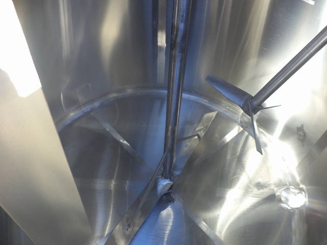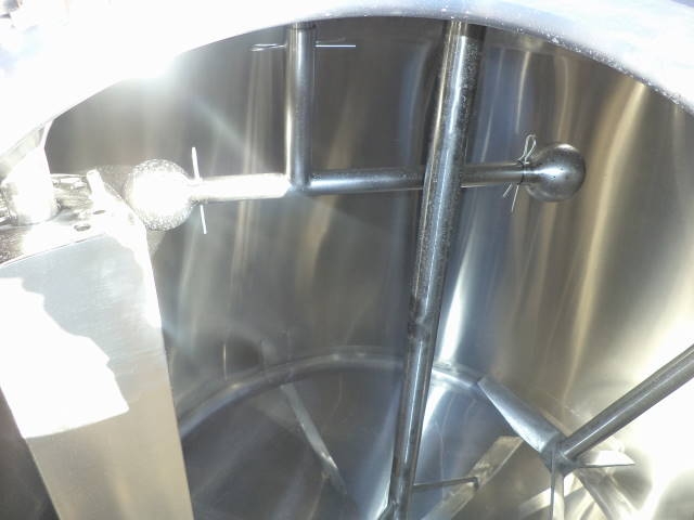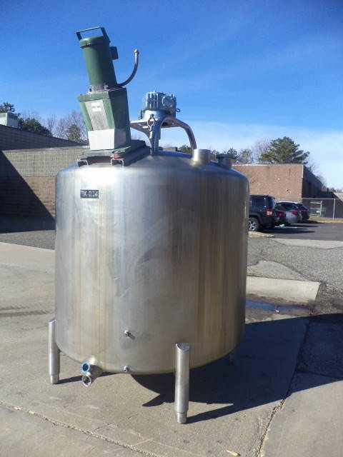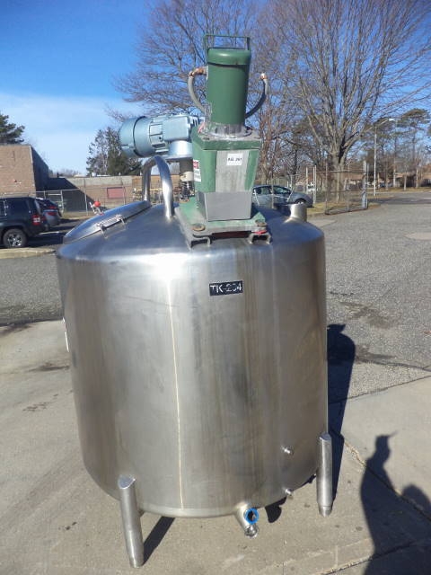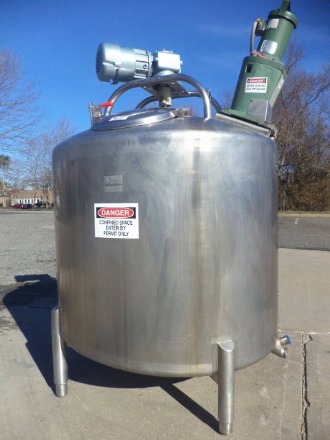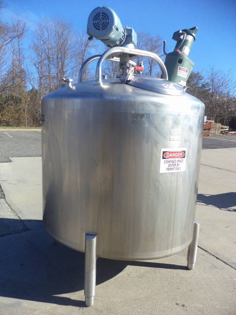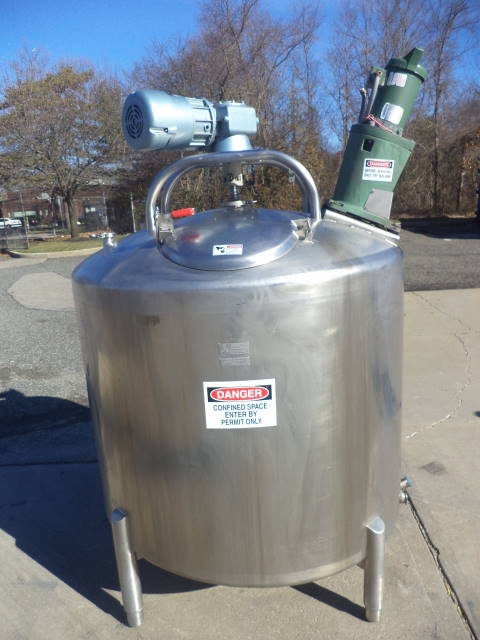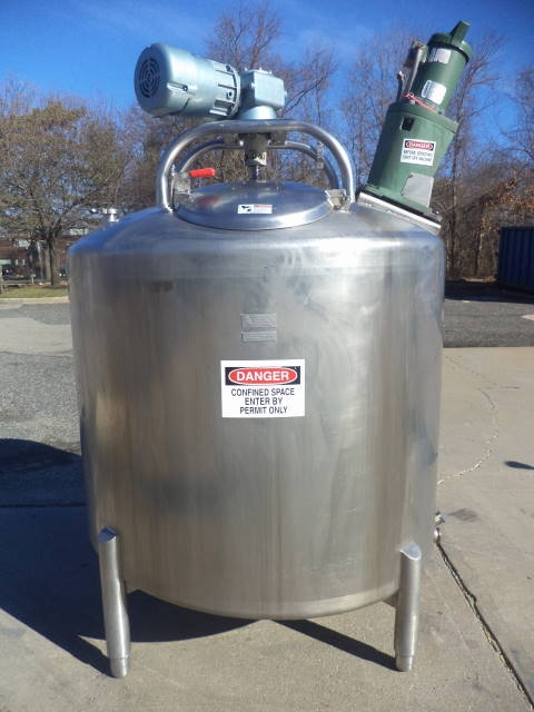 1-Used DCI 500 Gallon Type 316 Stainless Steel Vertical Mix Tank, S/N 82D-28699-B.  Dimensions approx. 60 inch diameter by 48 inch on straight side plus sloped bottom.  Equipped with dished top with 18 inch diameter off-center manway with hinged lid and four assorted additional smaller openings. With sweep agitator driven by 1HP, 3/60/230-460 Volt motor as well as 18 inch wide diameter pitched blade agitator driven by Lightnin 2.3HP 3/60/208-230/460 Volt motor.  Last operated in food production, tank has dual CIP sprayballs and stationary baffle.  On approx. 16 inch high stainless steel legs, there is a dual tri-clamp discharge with 3 inch diameter and 2 inch diameter, respectively. (Stock #7972)