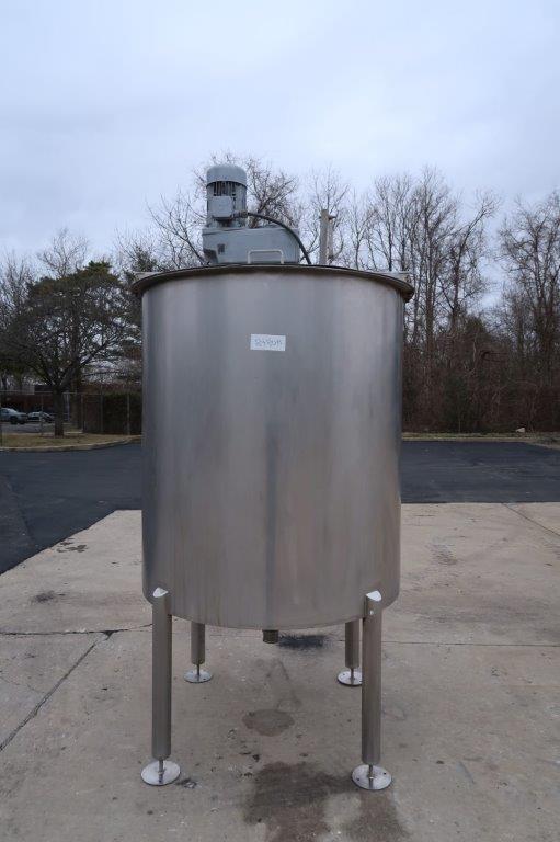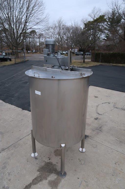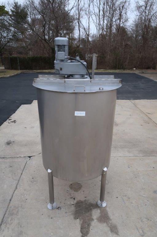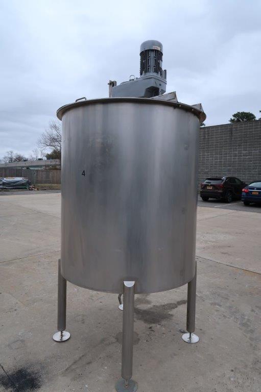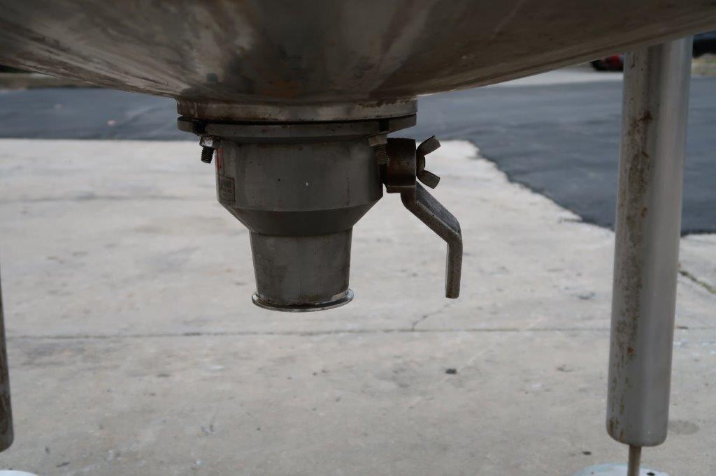 1-Used Approximately 600 Gallon Type 316 Stainless Steel Vertical Cone Bottom Mix Tank. Dimensions approximately 54 In. diameter X 60 In. on straight side plus cone bottom head. Equipped with Frame type sweep agitator driven by top mounted Nord 5HP, 3/60/208-230/460 Volt motor/reducer, tank also has two stationary interior baffles. With approximately 3 In. diameter center bottom outlet with Lee “Fluid-Flow” valve, tank has sectional stainless steel hinged lid.  Mounted on approximately 33 In. high stainless steel legs, tank was last used in food industry. (Stock# 8480B)