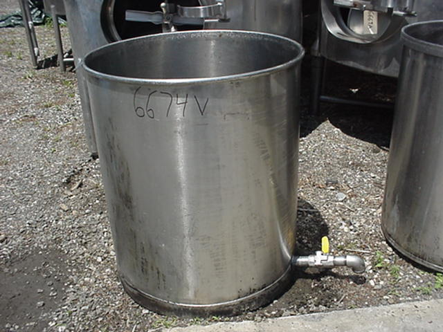1-Used approximately 85 gallon stainless steel vertical tank. Dimensions approx. 28″ diameter by 36″ deep. Tank has approx. 1-1/2″ diameter discharge outlet with valve.