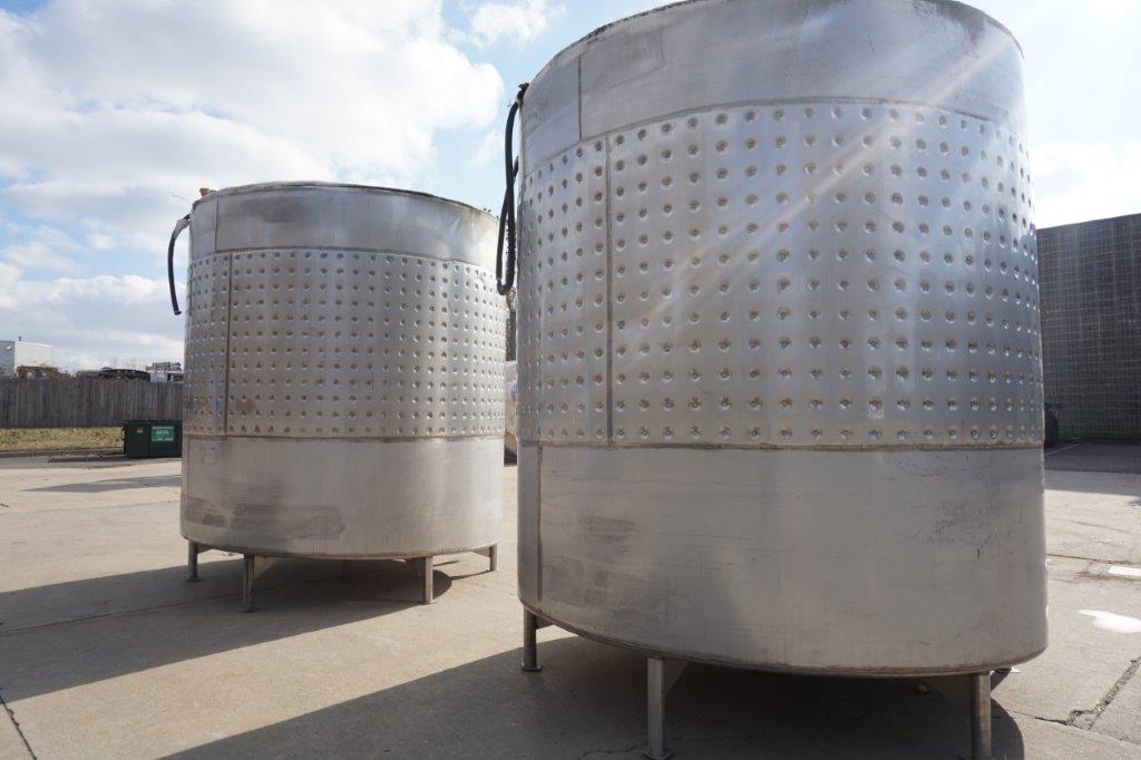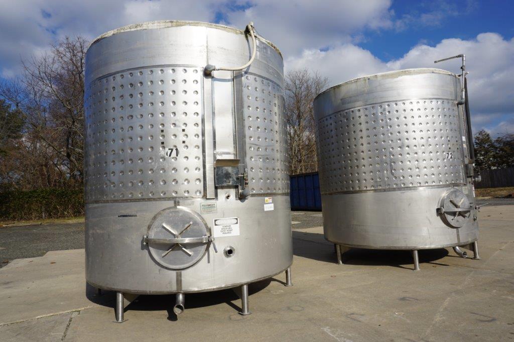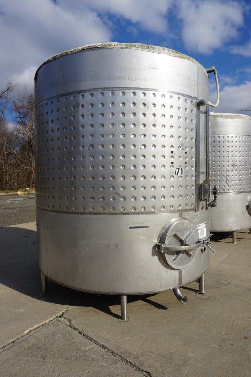 1- Used Feldmeier 3,000 Gallon Stainless Steel Jacketed Vertical Tank. Last used in the wine industry, tank measures approx. 8 Ft. Diameter X 8 Ft. on straight side plus 14 inch high stainless steel legs. With dimple jacket, tank has approximately 18 inch diameter side manway with hinged lid and Tri-clamp bottom discharge outlet as well. (Stock #8464AB)