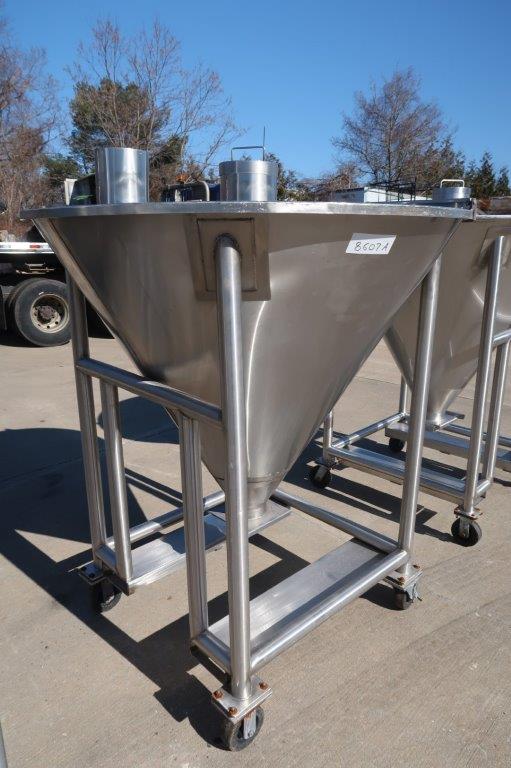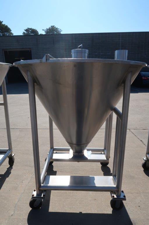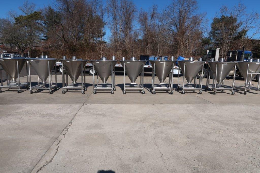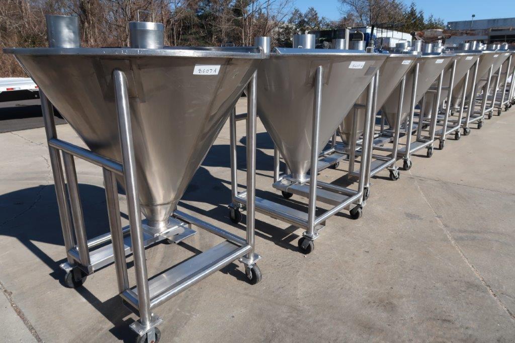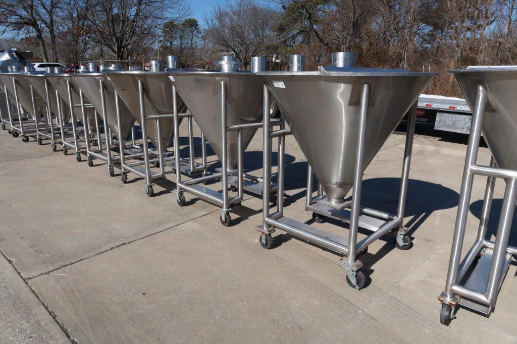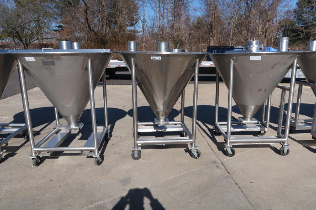 9 – Used Highland Equipment Stainless Steel Sanitary Cone Bottom Totes. Dimensions approx. 54 In. diameter at the top X 48 In. deep, these cone bottom vessels are on casters for portability. With 6 In. diameter center bottom outlet with slide gate valve, units have stainless steel hinged lids and are set up for forklift handling. Last used in the pharmaceutical industry. (Stock # 8607A)