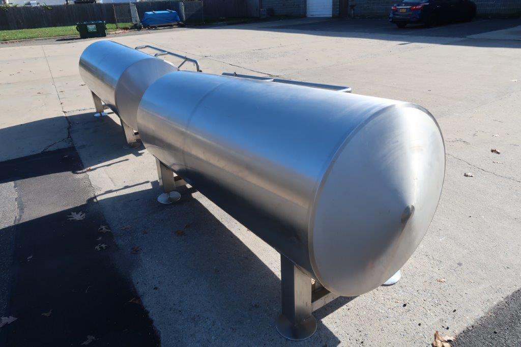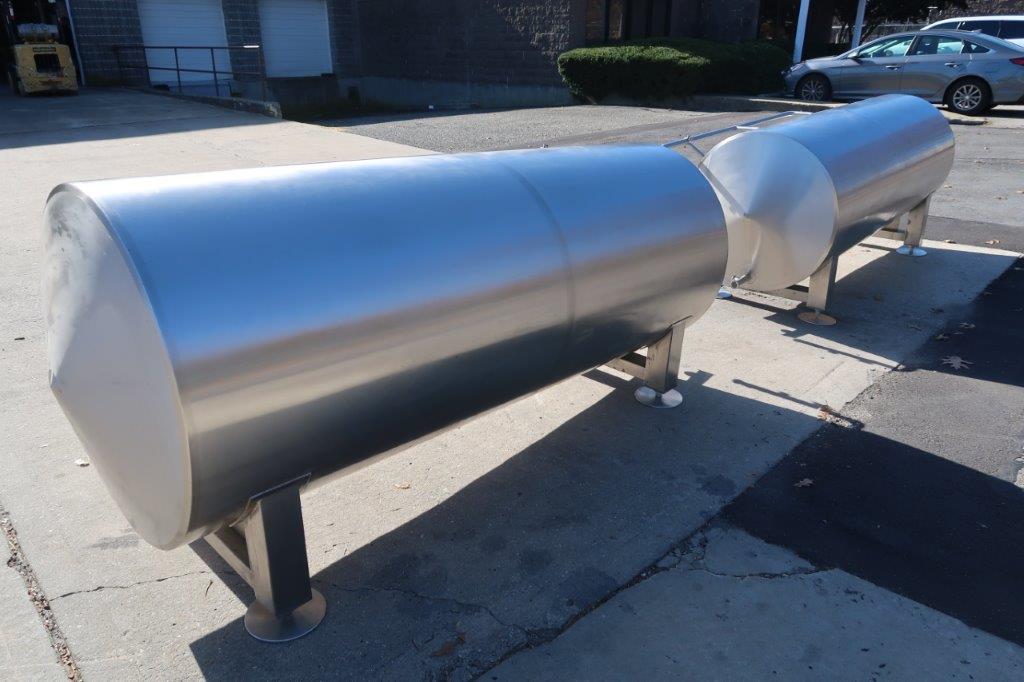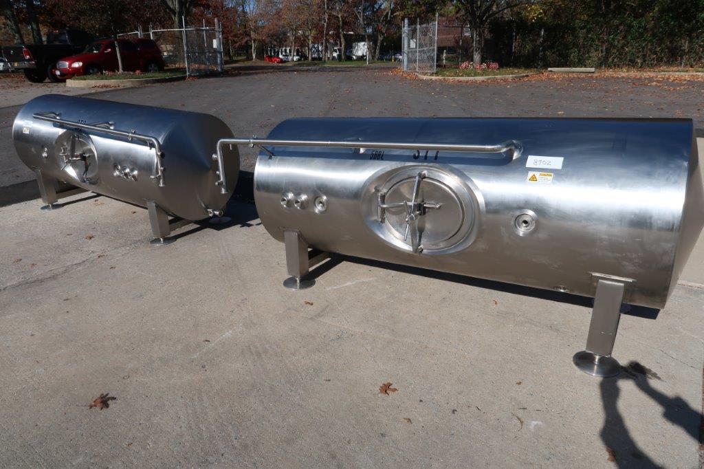 2-Used Premier Stainless 5BBL Stainless Steel Horizontal Jacketed Tanks.  Each tank is approximately 155 gallons and measure approximately 30 In. diameter X 85 In. long.  With 14 In. X 16 In. side manway with quick opening door, tanks have assorted Tri-Clamp inlets and approximately 2 In. diameter Tri-Clamp discharge. On legs, tanks last used in the wine/distillery industry. (Stock #8702)