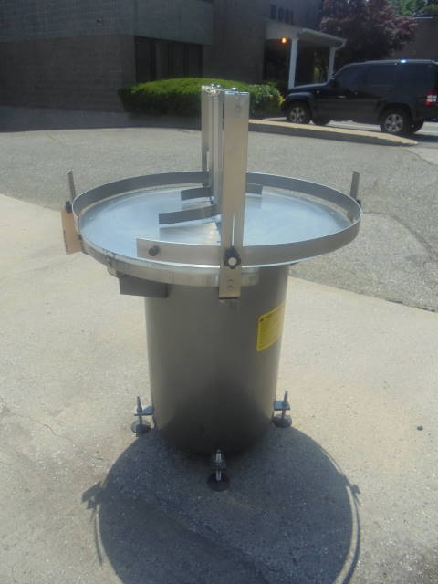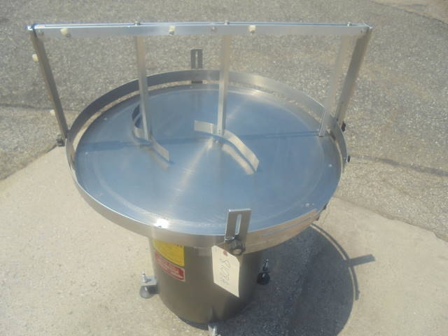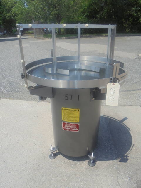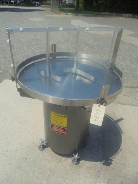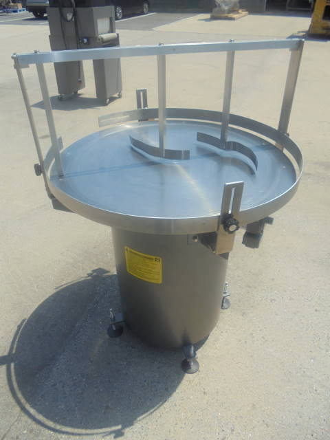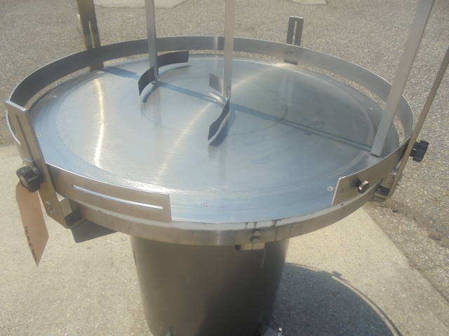 1-Used Kaps-All 36 In. Rotary Unscrambling/Accumulating Table Model FS-S-36, S/N 3958. With stainless steel top disc, Table has guide rails and driven by single phase electrics motor with variable speed control. (Stock #8108A)