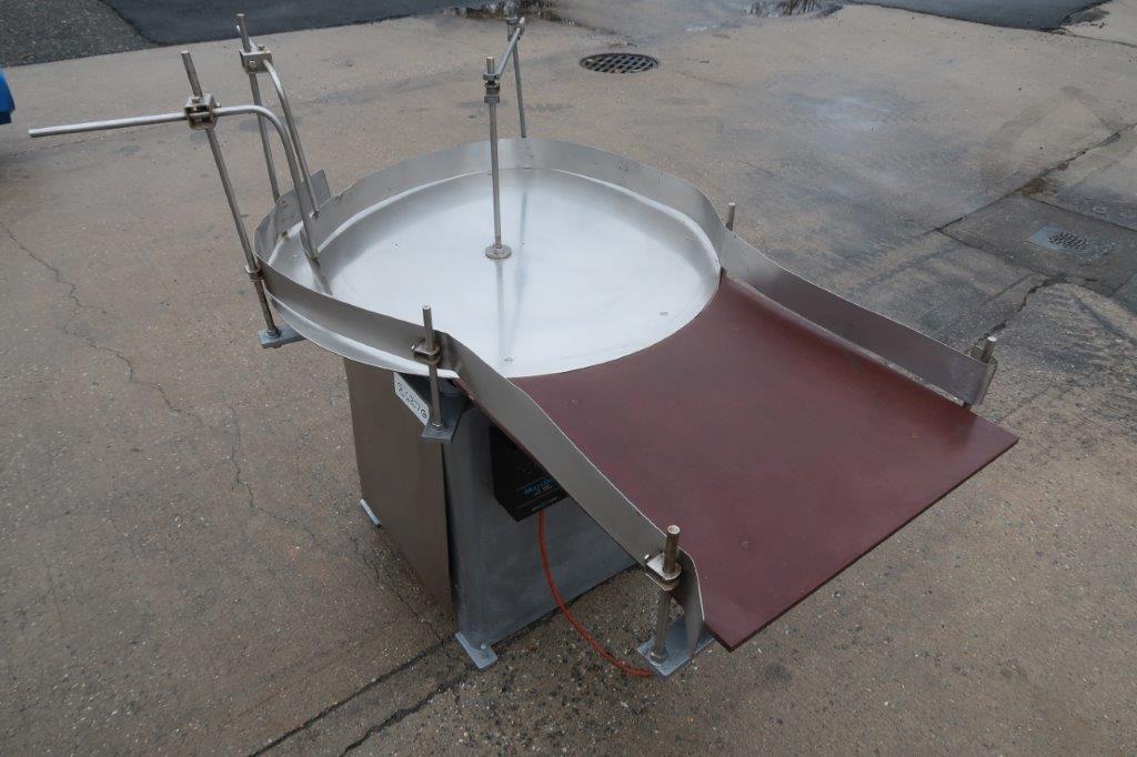 1-Used Packaging Dynamics 36 In. Diameter Rotary Unscrambling /Accumulating Table, Serial Number M88108. With stainless steel disc, table has unscrambling shelf and is single phase, 115 Volt electrics. Equipped with Penta Power variable speed control. (Stock #8627G)
