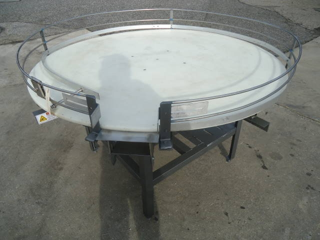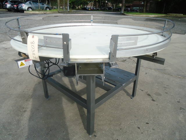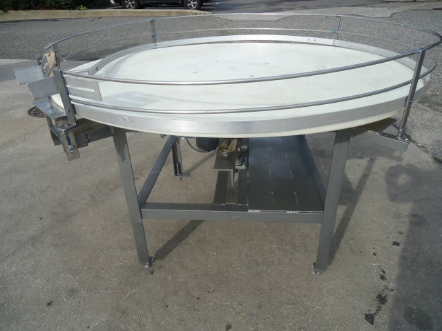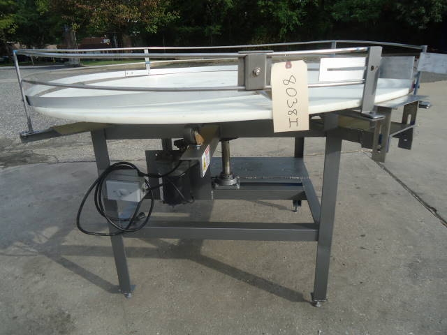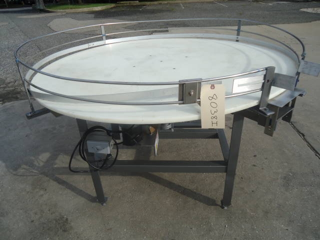1-Used 60 Inch Diameter Rotary Unscrambling/Accumulating Table.  Mounted on legs, table has guide rails and is driven by Dayton 1/4 HP, 1/60/115 Volt motor.  (Stock #8038i)