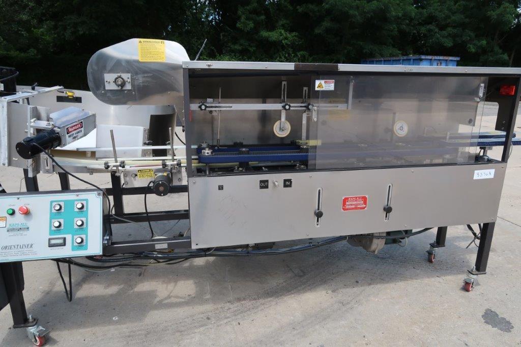 1- Used Kaps-All Model AU-6C Automatic Plastic Bottle Unscrambler, Serial number 4423. Rated up to 300 bottles per minute, machine is manufacturer rated suitable for containers up to 6 In. diameter by up to 12 In. tall. Machine is on casters for portability and is equipped with Air Ionizer Cleaning feature with motorized blower. Machine has front mounted control panel with variable speed controls, machine has single phase electrics. (Stock # 8536A)