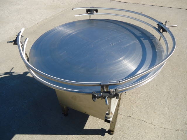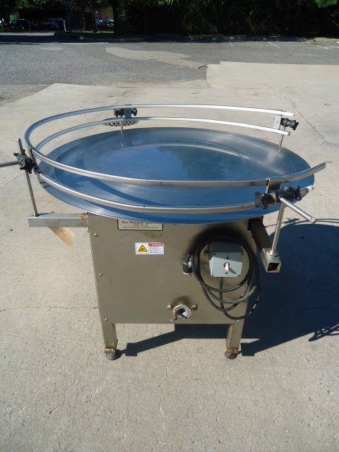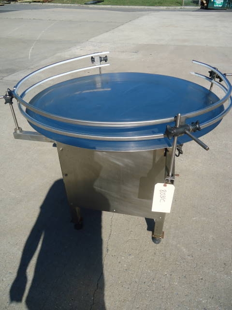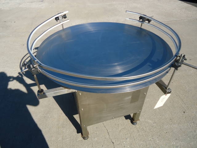 1-Used KISS Packaging 42 in. diameter Rotary Unscrambling/Accumulating Table.  Equipped with Stainless Steel Top Disc.  With Variable speed control, table has  Single phase electrics.  (Stock #8031C)