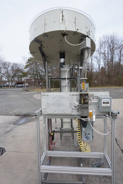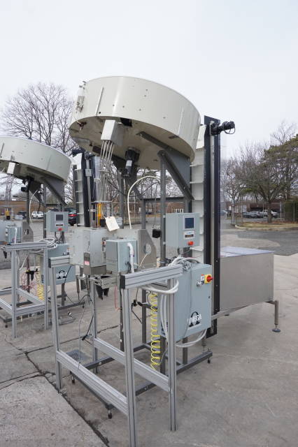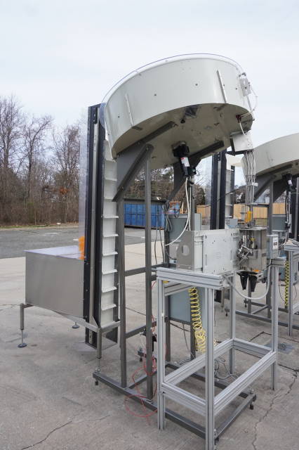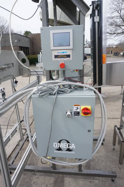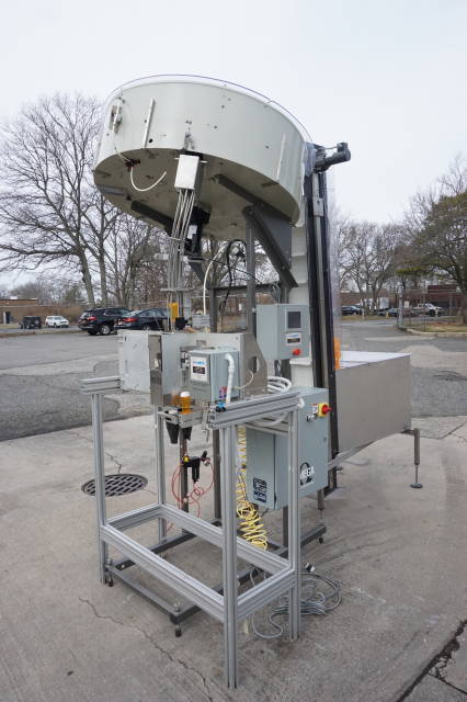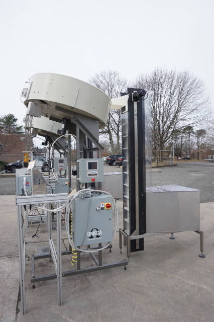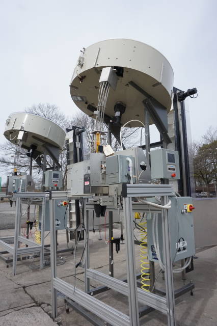 6-Used Omega Model 4D-SPL Plastic Bottle Unscramblers.  Equipped with top mounted 48 in . diameter bowl, each Unscrambler has self-contained starter box panel and was last used for unscrambling plastic bottles at major pharmacy distribution company. With Automation Technologies SJF-3 transition piece which has label printing capabilities, unscramblers can be supplied with Omega Elevator shown at additional cost.  Single phase, 60 cycle. (Stock # 8342C)