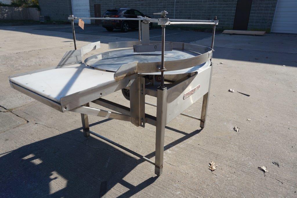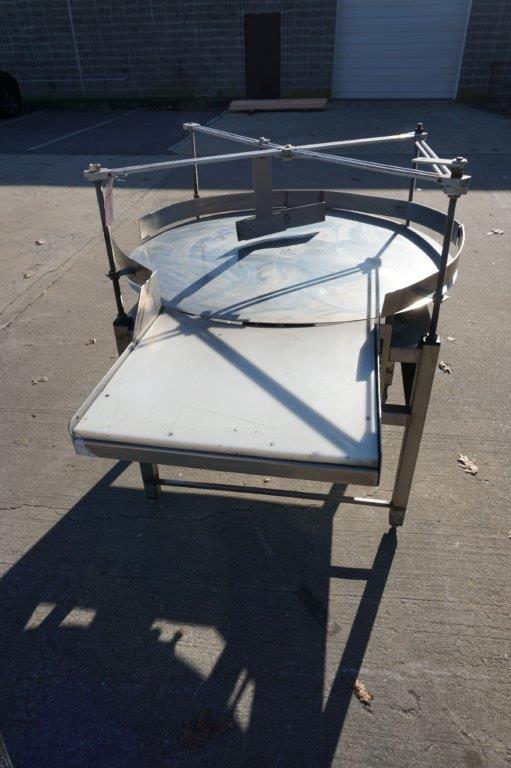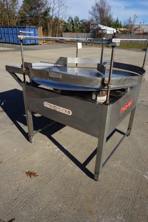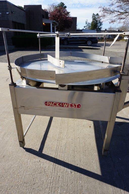 1-Used PackWest 48 In. Diameter Stainless Steel Rotary Unscrambling/Accumulating Table. Equipped with unscrambling shelf, machine last used in food industry. (Stock #8435C)