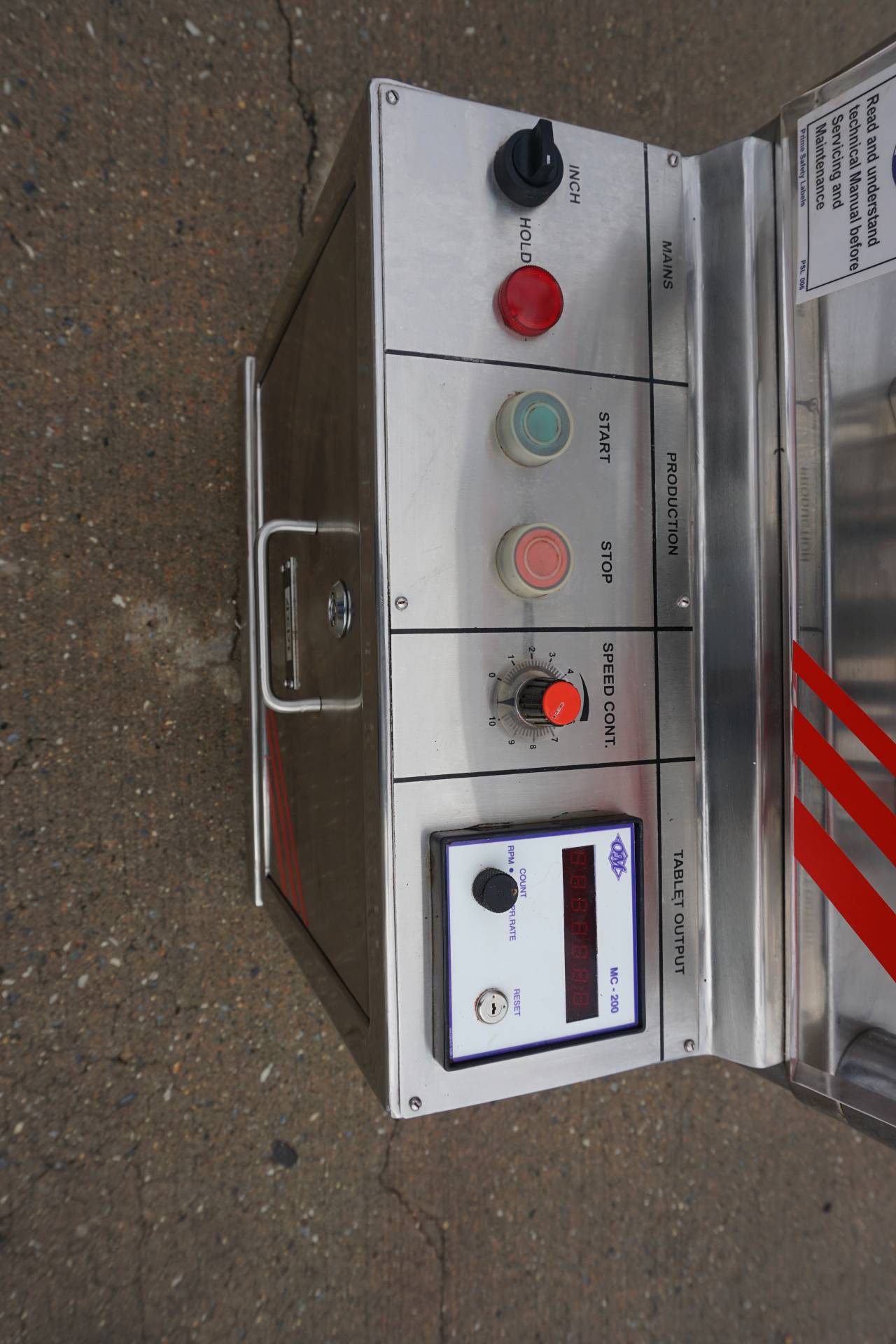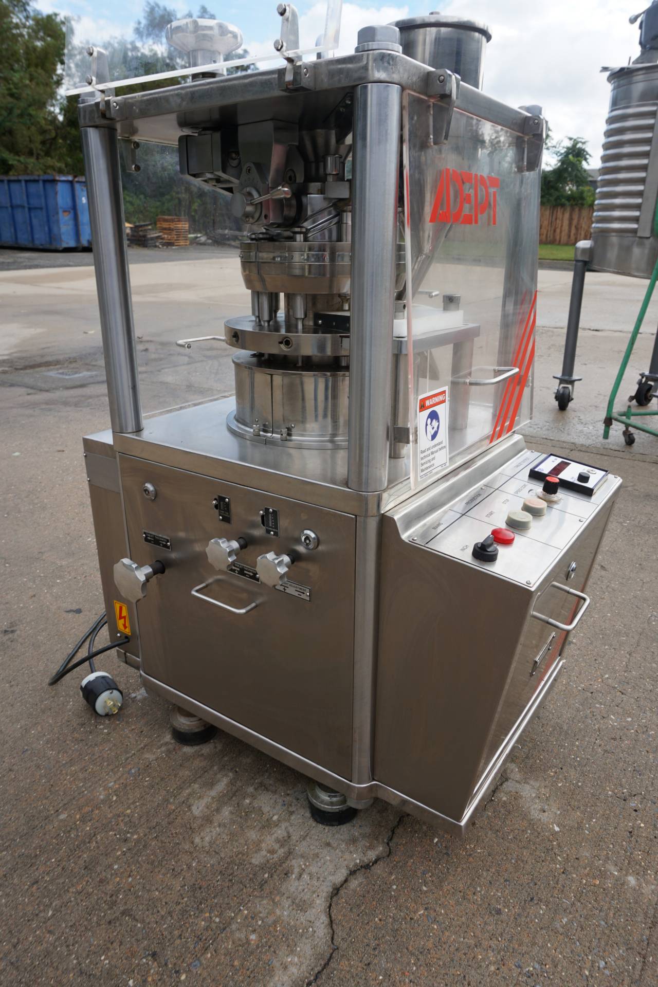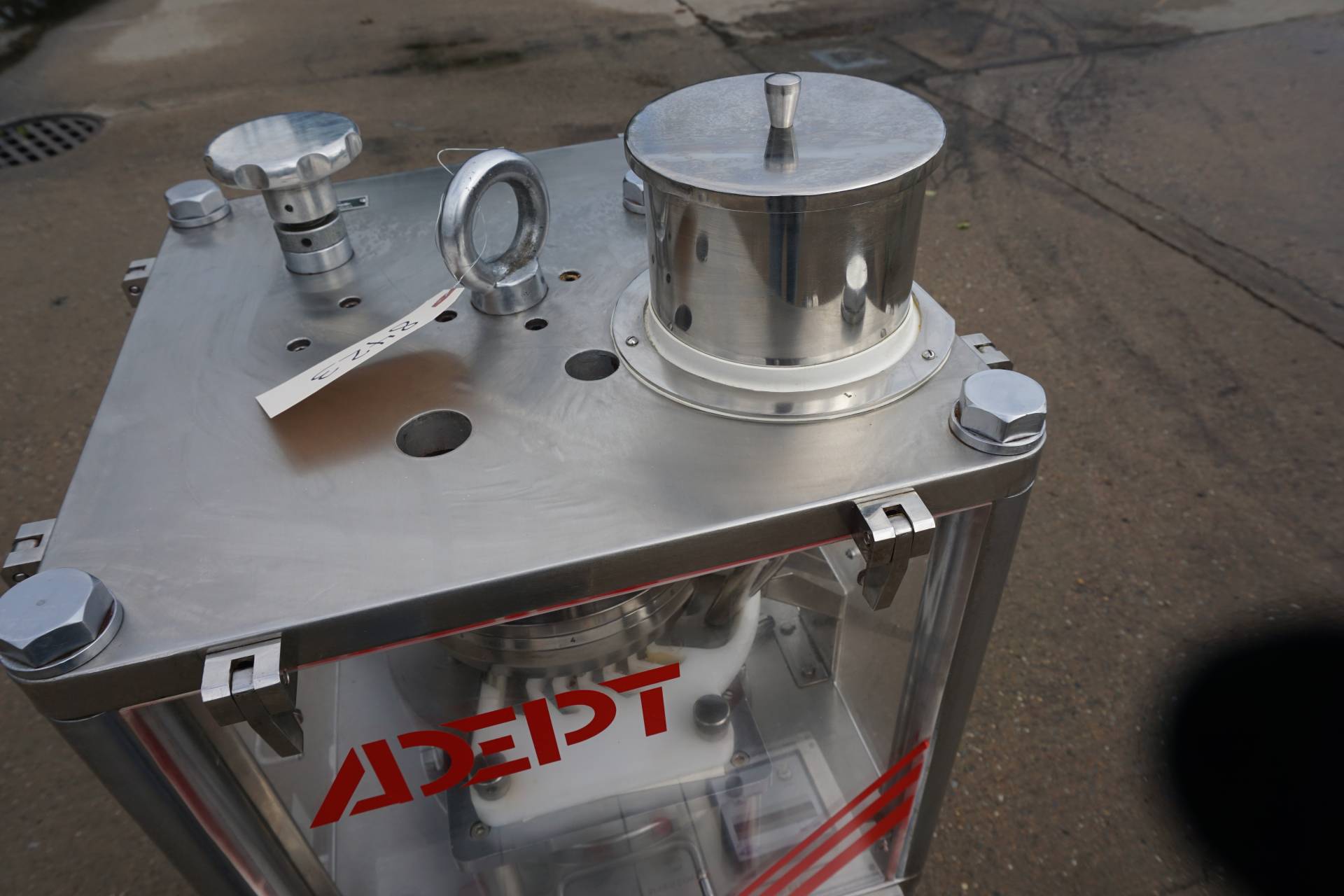 1-Used Adept 10 Station Tabletop Rotary Tablet Press, Model BB10, S/N 201521. This R&D tablet press has keyed top turret and stainless steel cabinetry. Equipped with 6 In. diameter product hopper and feed frame, machine has control panel with adjustments for tablet thickness and tablet weight. Equipped with variable speed control and tablet counter gauge, electrical specifications 3/60/230 Volt. (Stock #8423)