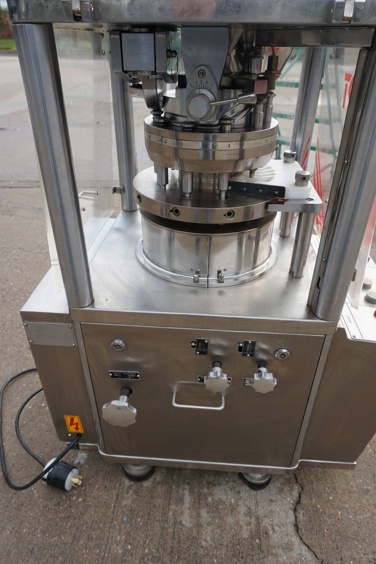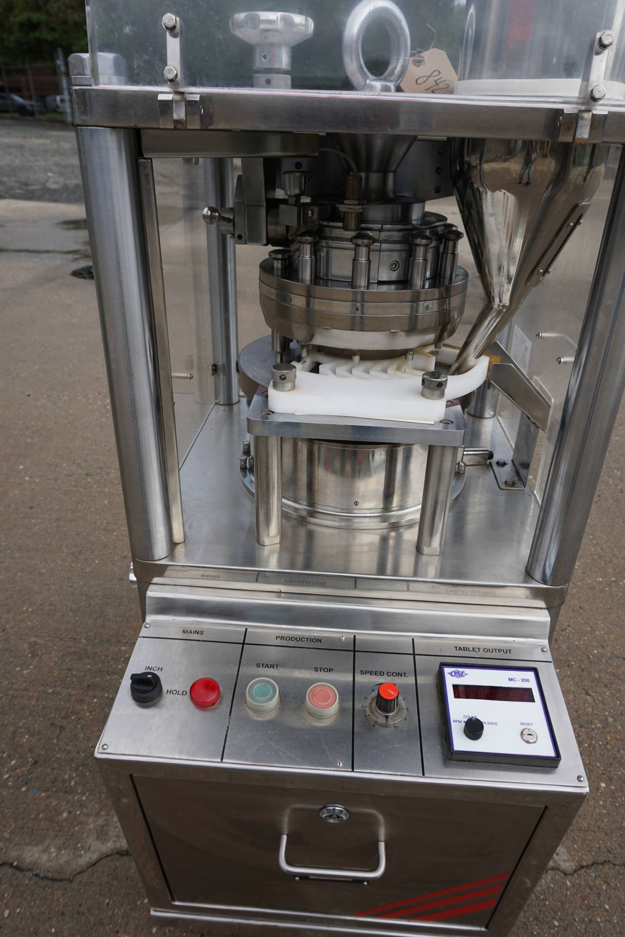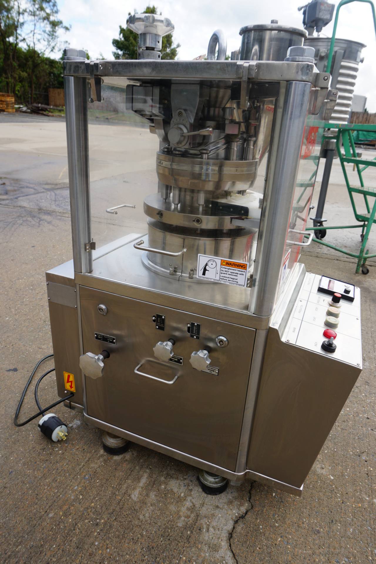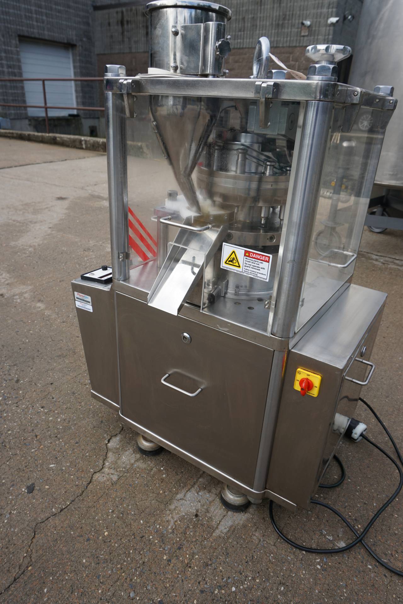 1-Used Adept 10 Station Tabletop Rotary Tablet Press, Model BB10, S/N 201521. This R&D tablet press has keyed top turret and stainless steel cabinetry. Equipped with 6 In. diameter product hopper and feed frame, machine has control panel with adjustments for tablet thickness and tablet weight. Equipped with variable speed control and tablet counter gauge, electrical specifications 3/60/230 Volt. (Stock #8423)