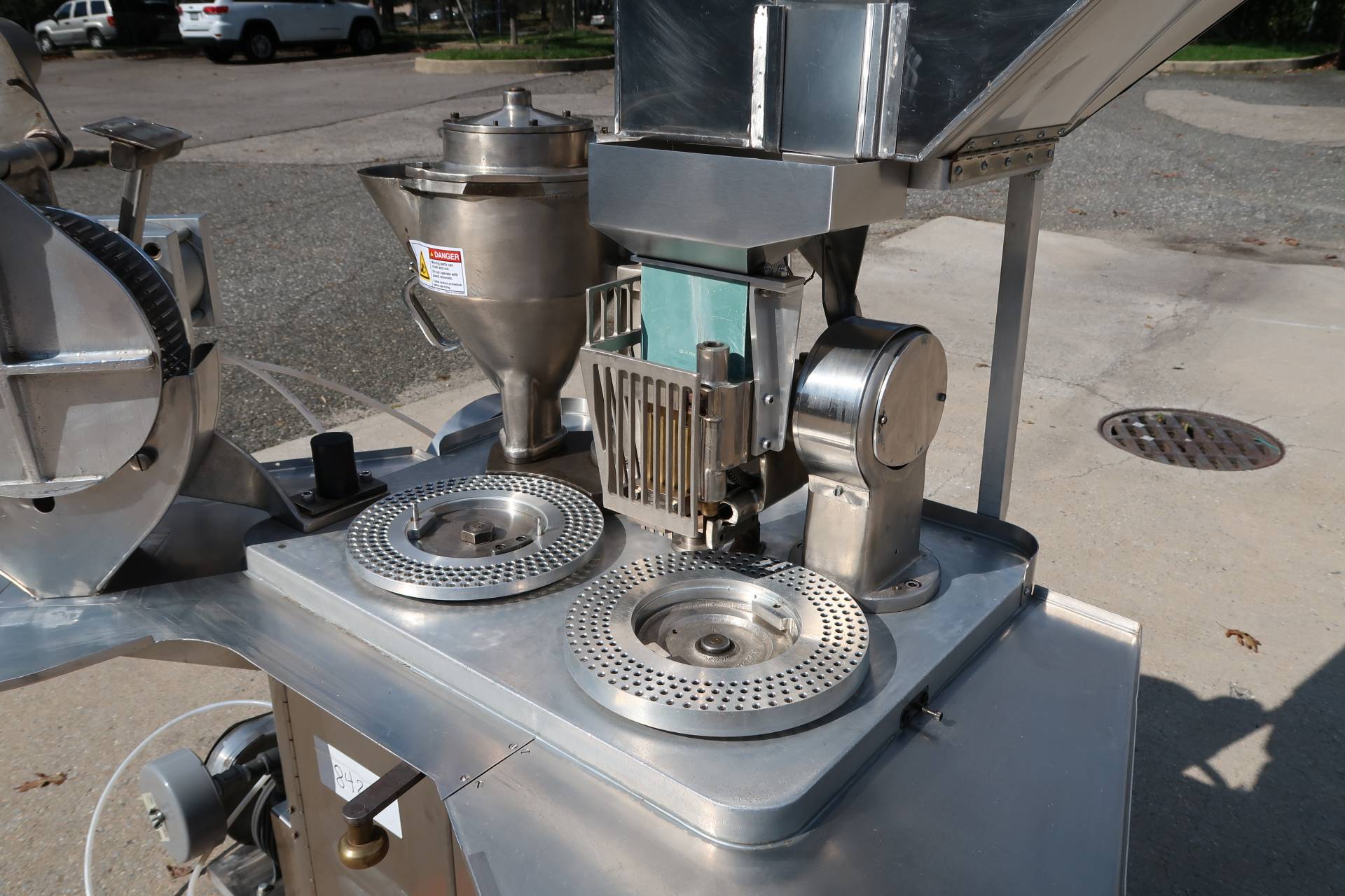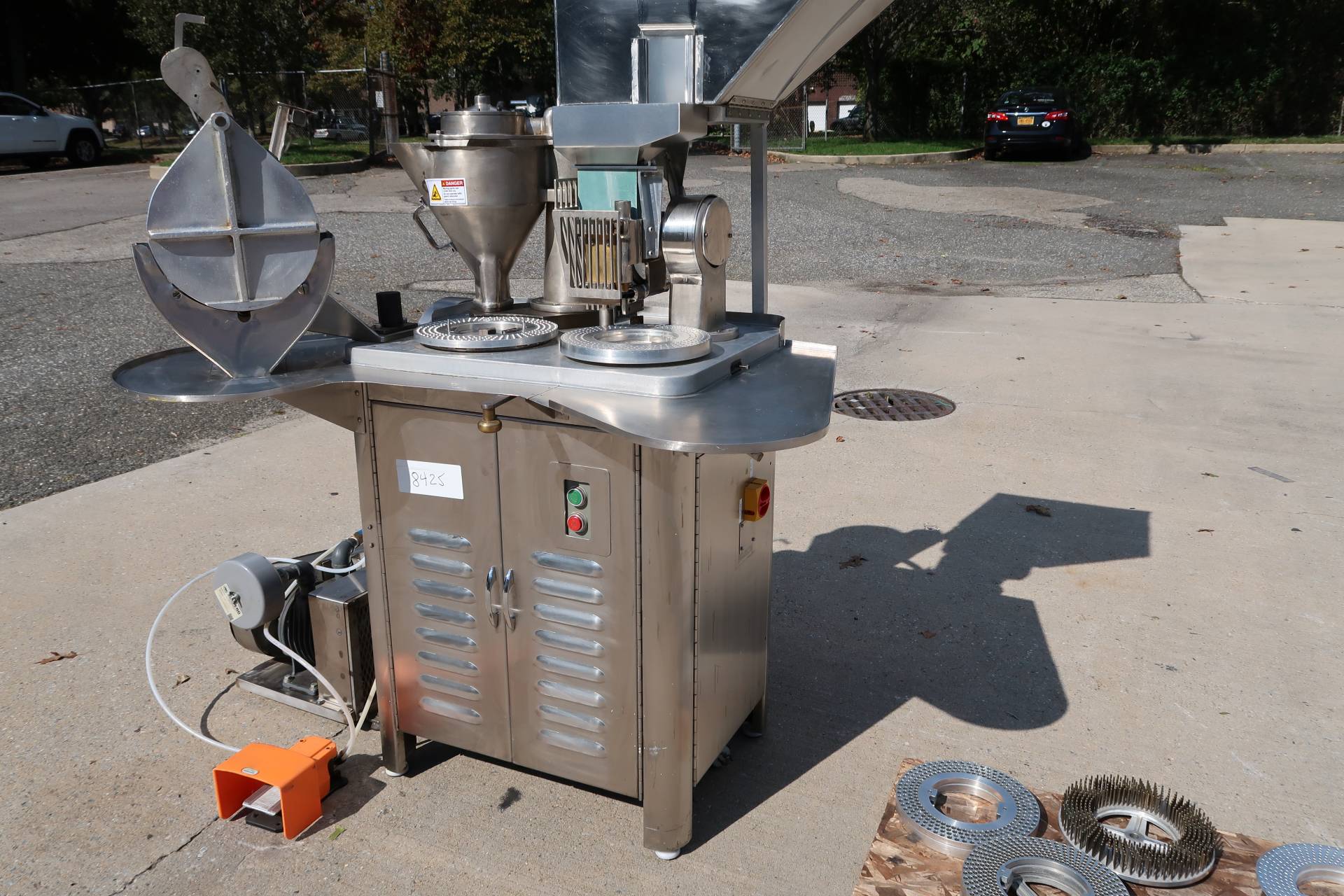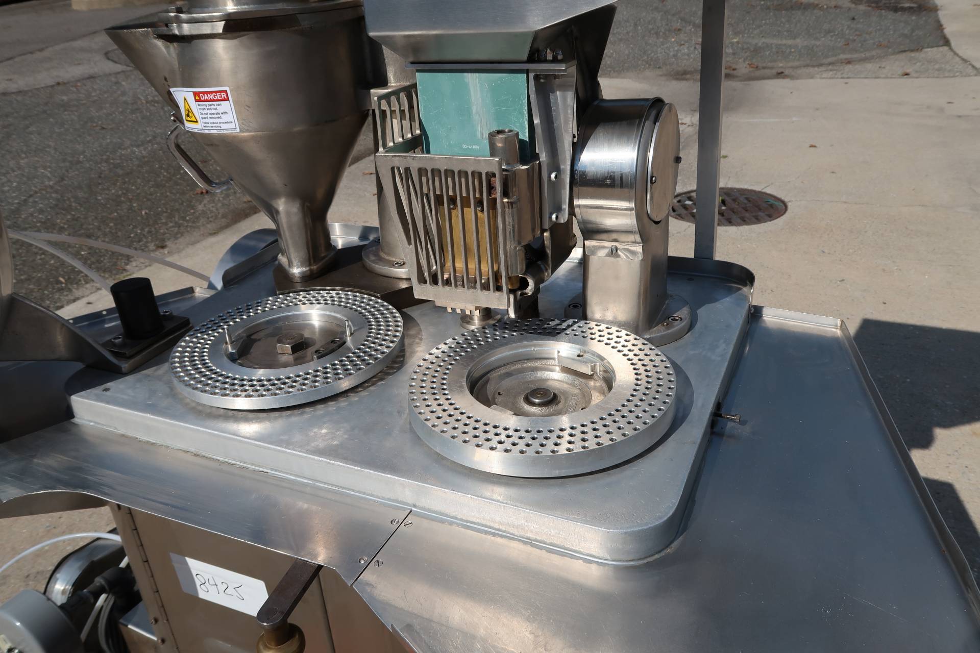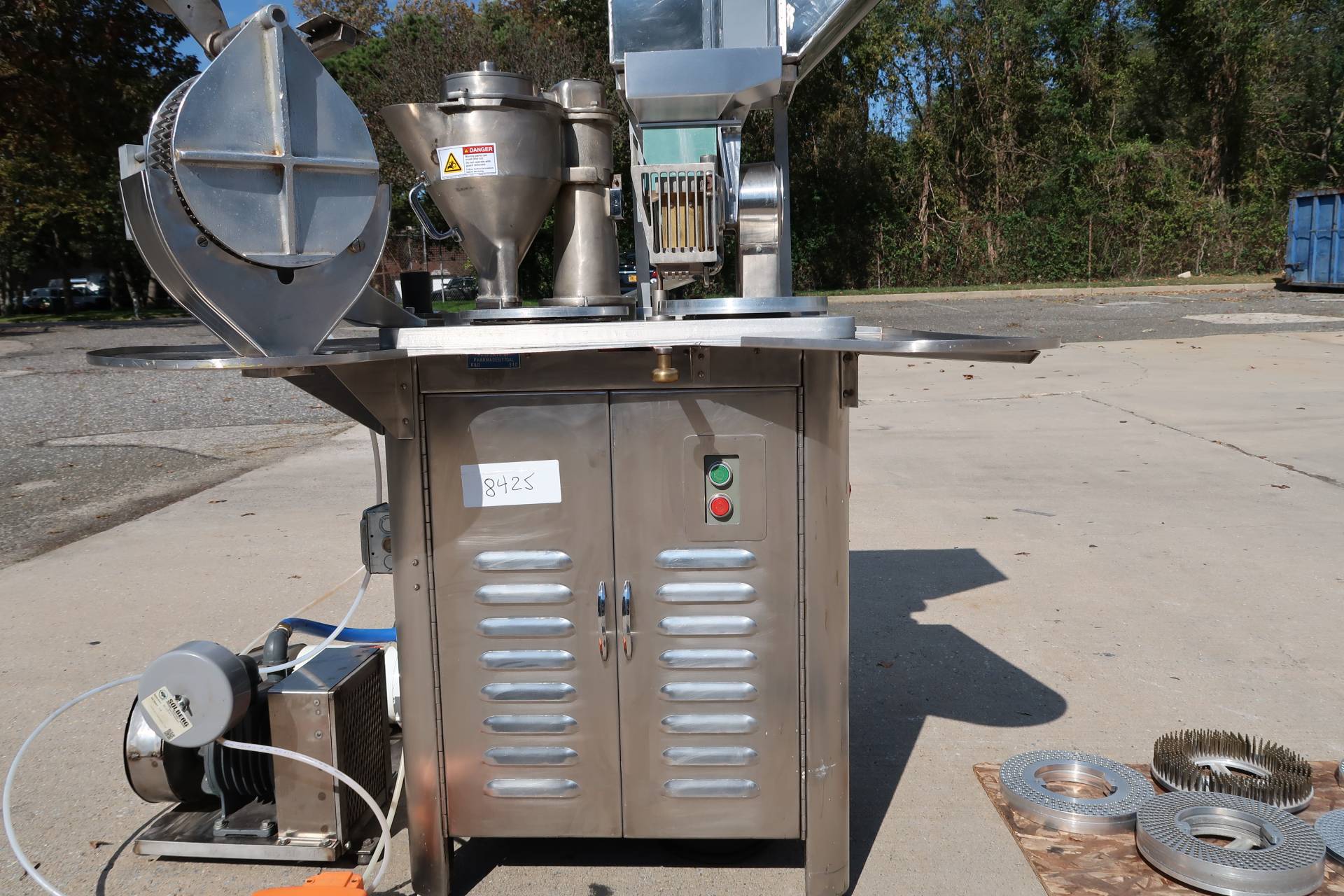 1-Used Capsugel Type 8 Semi-Automatic Capsule Filling Machine. Rated up to 15,000 capsules per hour, Machine has stainless steel cabinetry and stainless steel contact parts. Capsule rings and associated parts for size “00”, size “1” and size “4” capsules are included. With top mounted hopper which is removable for cleaning, machine comes with vacuum pump, foot pedal and was last used in vitamin production. Electrical specifications 3/60/240/480 Volt. (Stock #8425)