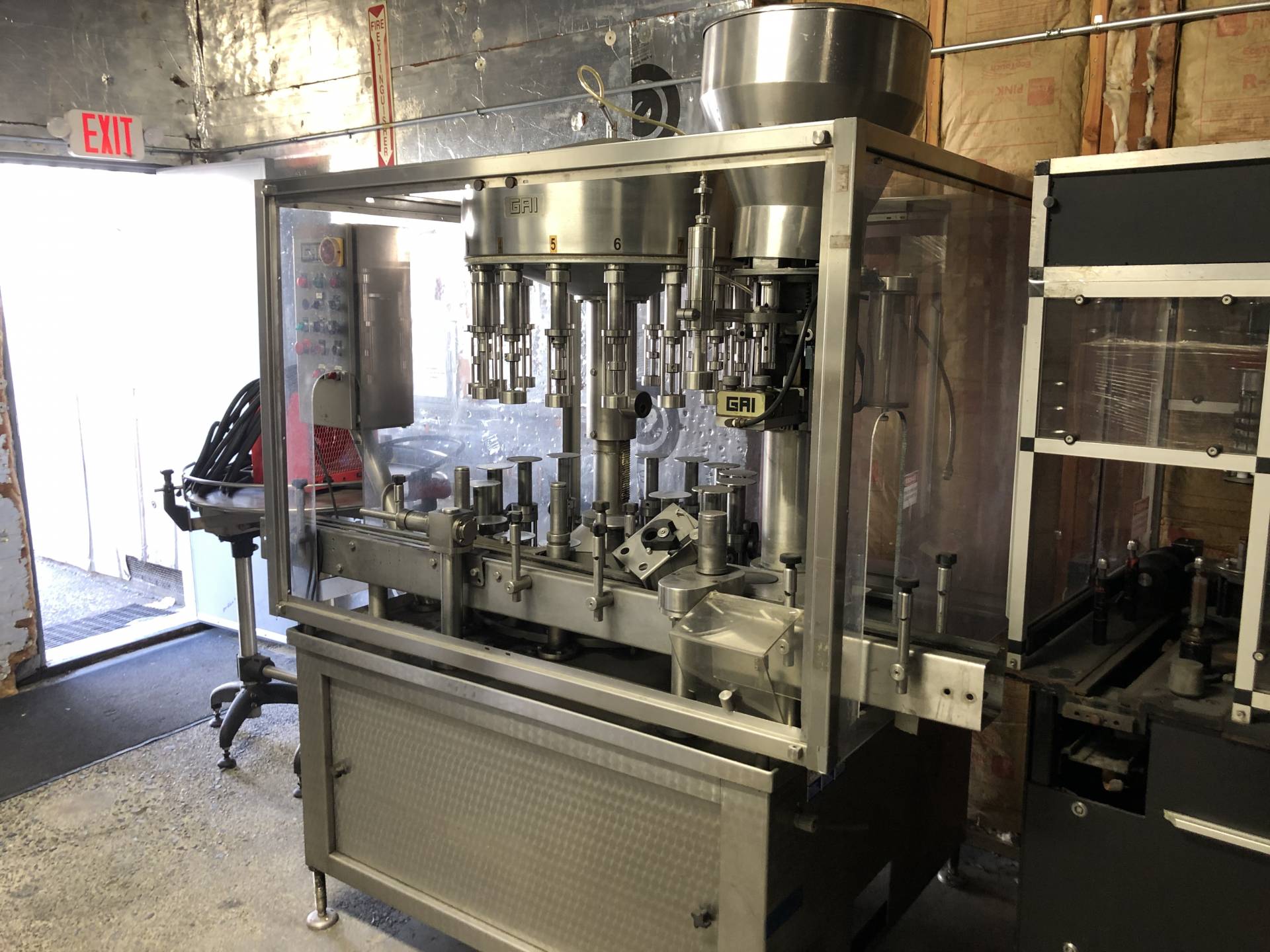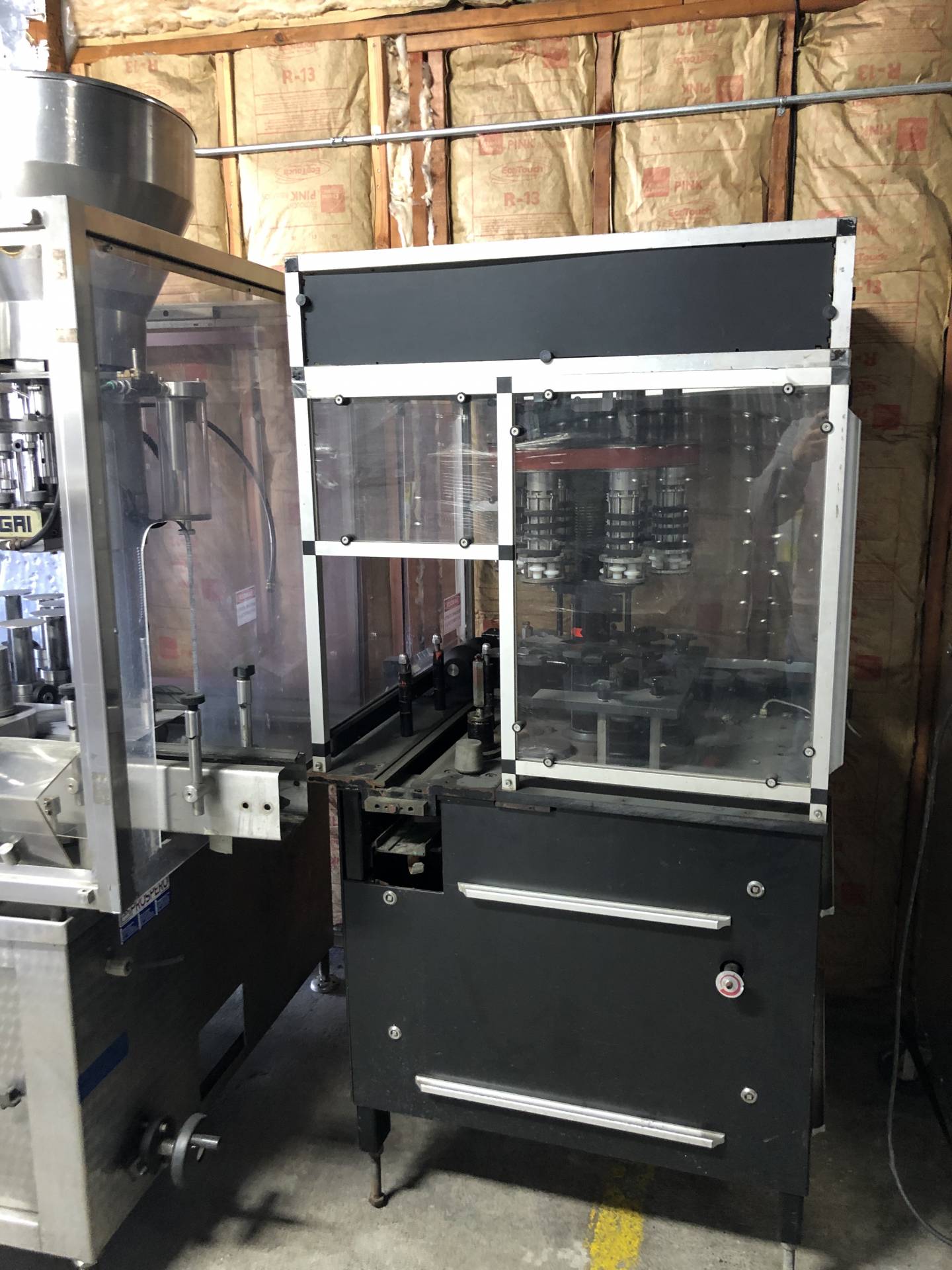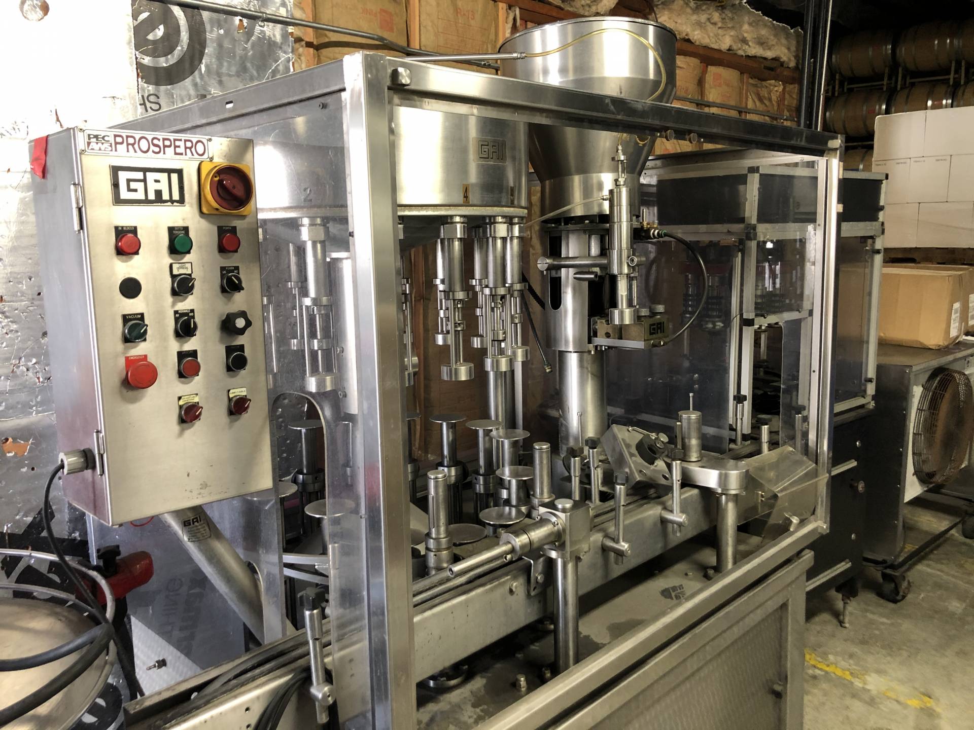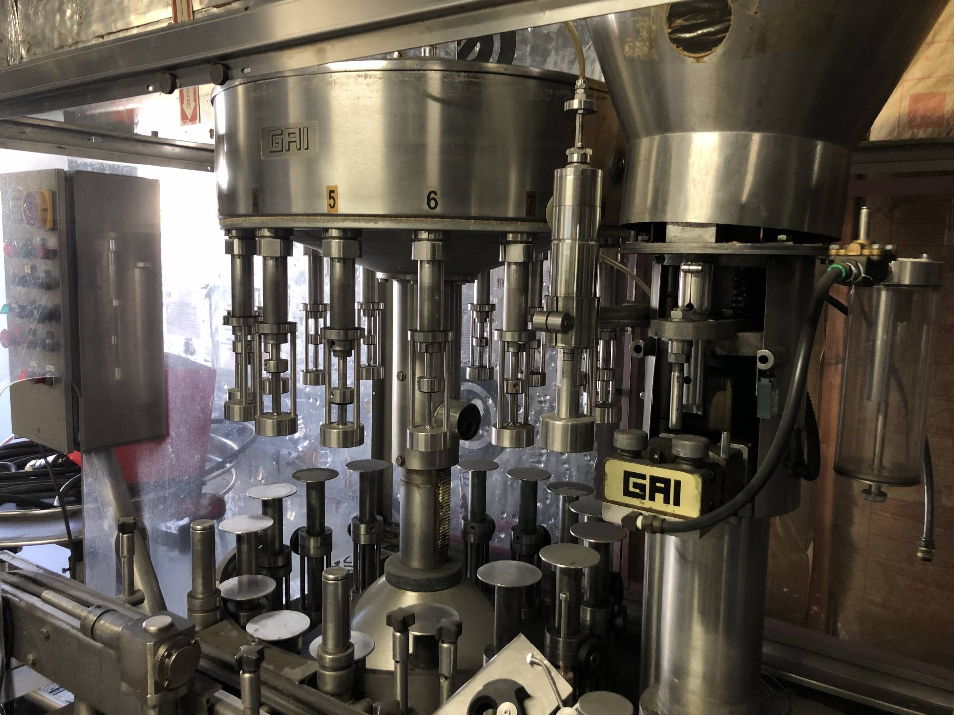 1-Used GAI 3000 Monoblock Wine Bottle Filling/Corking Line. Equipped with 16 head filler with corker, Line includes six head Capsular spinner and rotary accumulating table. With a variety of change parts including for 750mL and 375mL bottles. (Stock #L1401)