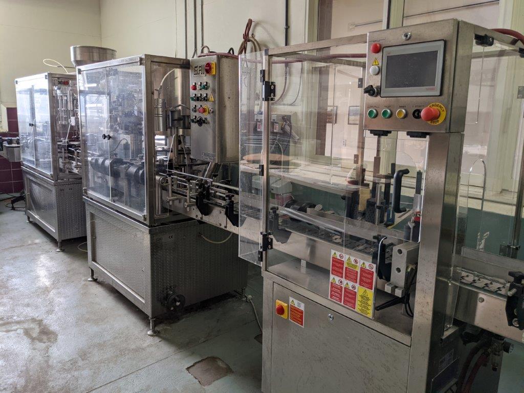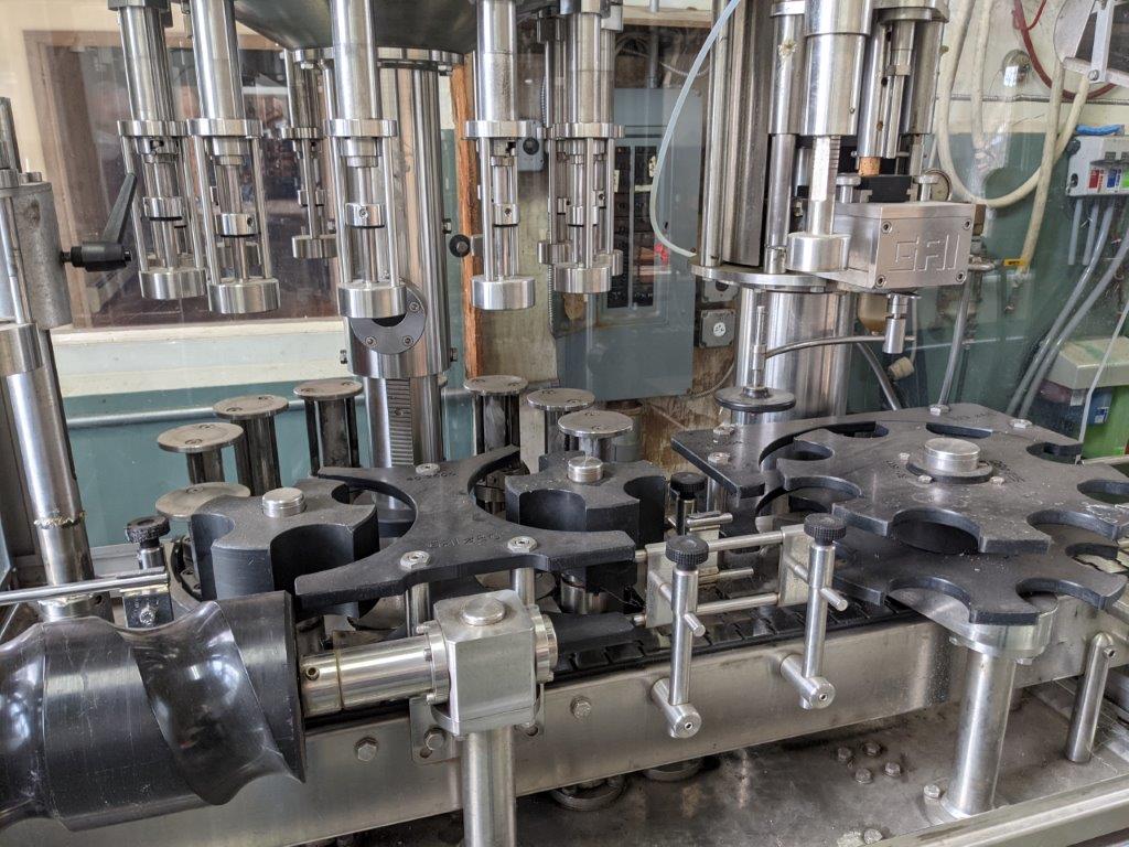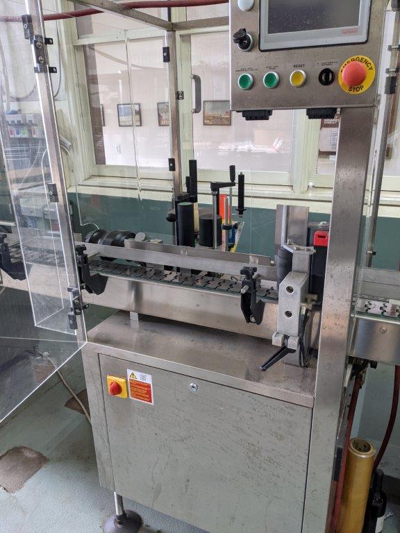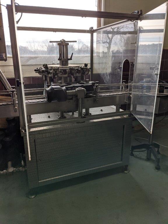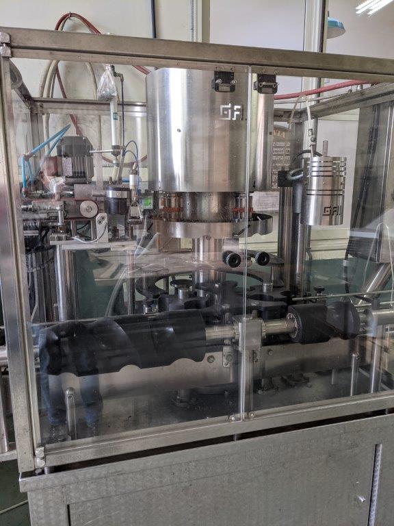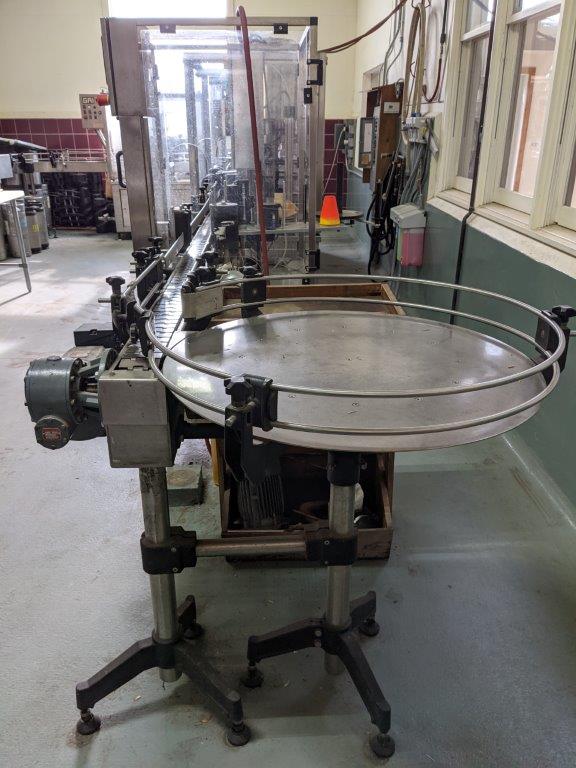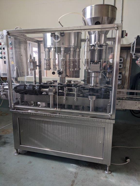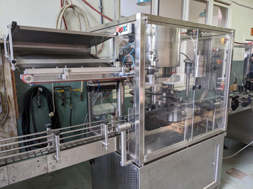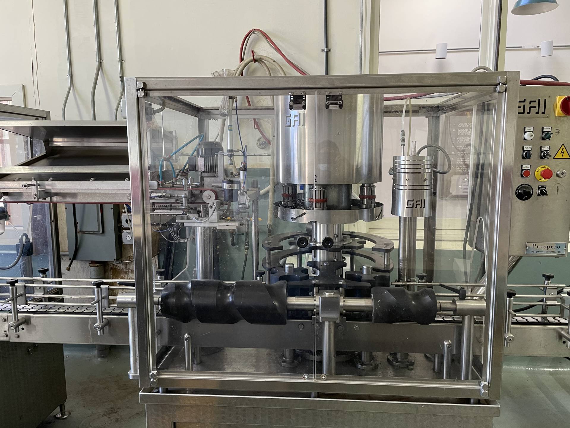 1-Used GAI/Prospero Wine Bottling Line. Line consists of multiple lane infeed table/belt, GAI 12 head rotary bottle rinser, GAI 12-station rotary filler with corker and sparger, GAI capsule dispenser with 4-head capsule spinner and heat shrink capsuler, Enos “Compatta” Pressure Sensitive Spot/Wraparound labeling machine and 32 inch diameter rotary accumulating table. Rated up to 2,666 bottles per hour on a 750mL bottle, line has change parts for 375 ml and 1.5 liter bottles as well. (Stock #L1414)