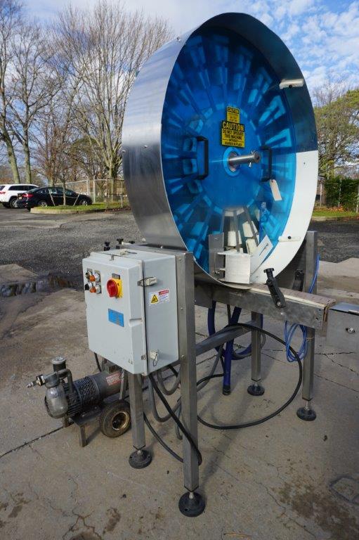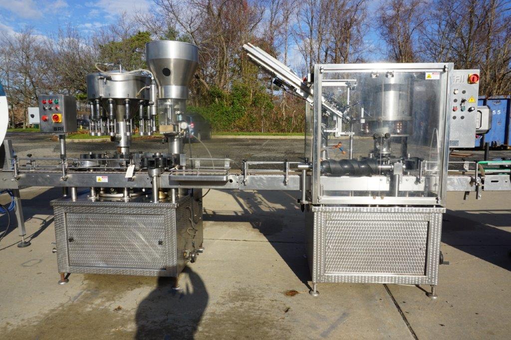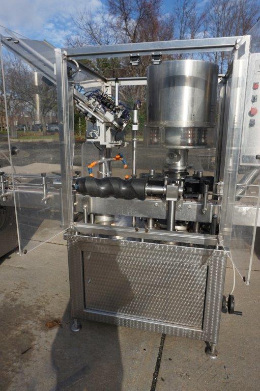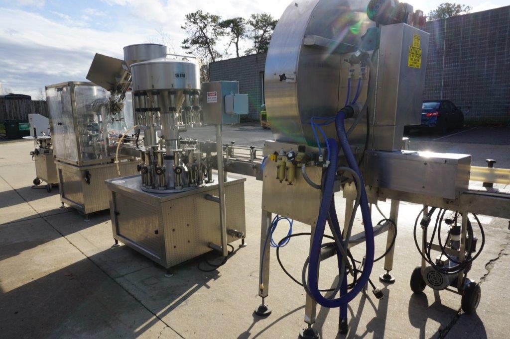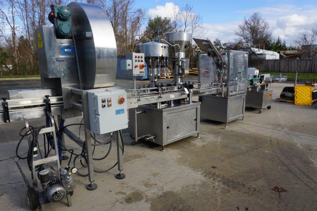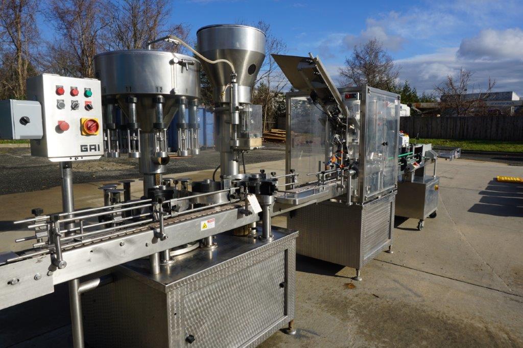 1-Used Wine Bottling Line, Rated up to approximately 55 Bottles Per Minute. Line has change parts for 750mL and 375mL Bottles, and includes Orbit/McBrady Model 60 Bottle Cleaner/Sparger, Serial Number A48-2883, GAI 12 Spout Rotary Filler with rising platforms, Rotary Corker, GAI model 4264D Automatic Capsule Machine, Serial Number SL-0320, and Pack Leader Model PL-11 Automatic pressure sensitive spot/wraparound labeling machine with 6 In. high wraparound belt and accumulating shelf. (Stock #8447)