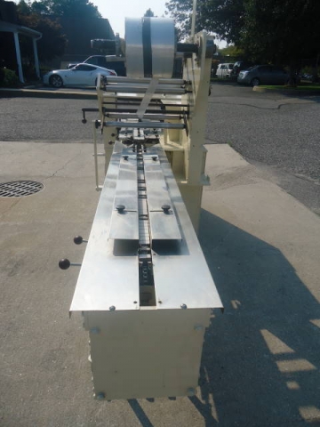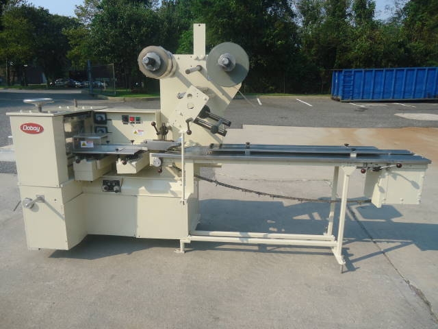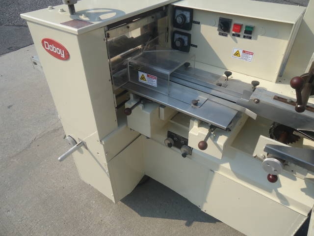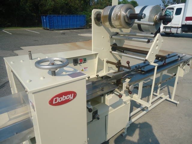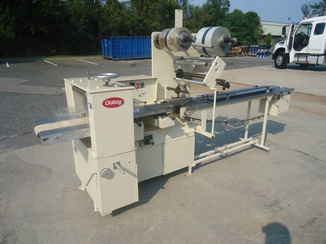 1-Used doboy “super mustang” horizontal wrapper, s/n 77-16008. Rated up to 120 units per minute, wrapper has approx. 6 foot infeed section and variator for variable speed control. Last used for packaging frozen carrot pudding cakes. Machine has belt take away conveyor and electric specifications are 3 phase, 60 cycle, 230 volt. (stock # 7515)